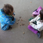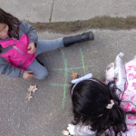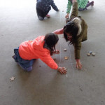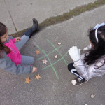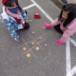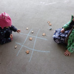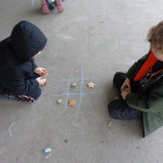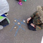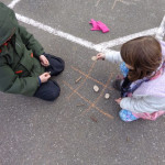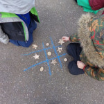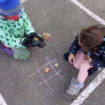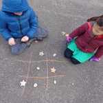 We have been working on offensive and defensive strategy in Tic Tac Toe.  Trying to win a game, while at the same time trying to make sure your opponent doesn’t win!  It is a lot to keep straight!!  We’ve been playing outside–using chalk to draw our game board and some of our new outside math manipulatives (counters) as game pieces.