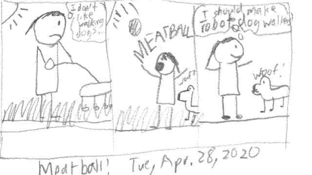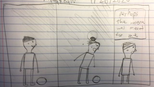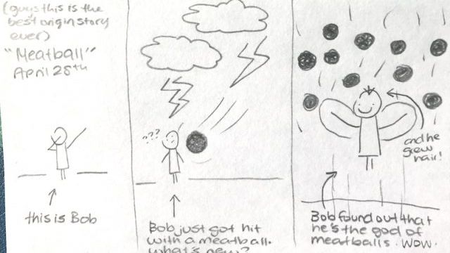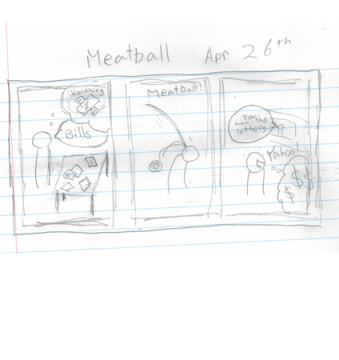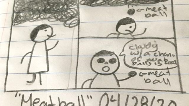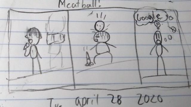Second panel: a meatball falling from the sky and hitting that person on the head.