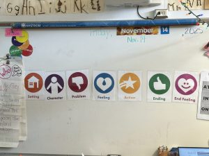 Story Writing– we are working through a program that teaches students step-by-step what elements need to be included in most stories and provides visuals and samples allowing students to learn and practice. Here is a visual of the story elements: setting, characters, problem, feelings, action (solution), ending and end feeling(s).