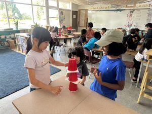 CHALLENGE! The students were given three red plastic cups and two pieces of cardstock. The challenge was to stack the cups with the cards in between and then try to pull out the cards and have the cups all stack together. Many were able to complete the challenge. They all worked together and seemed to have fun doing so.