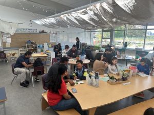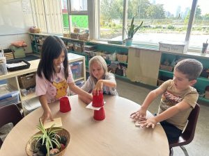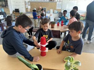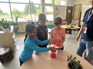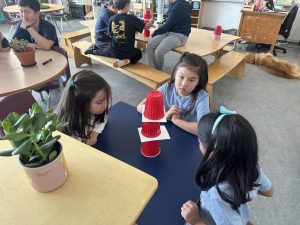 CHALLENGE! The students were given three red plastic cups and two pieces of cardstock. The challenge was to stack the cups with the cards in between and then try to pull out the cards and have the cups all stack together. Many were able to complete the challenge. They all worked together and seemed to have fun doing so.