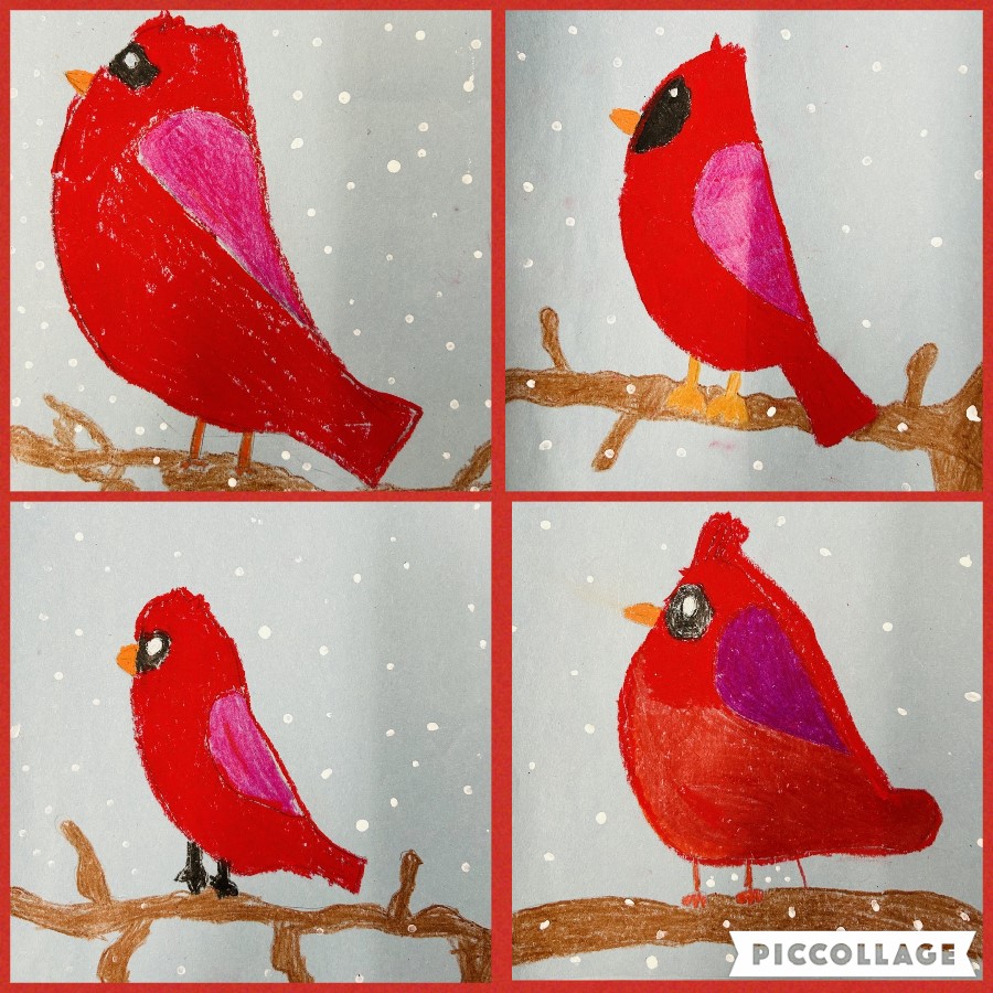 In addition to learning the scientific fact that cardinals can retain thermal energy, the class also practiced paragraph writing on the subject. Students further engaged in a directed drawing activity, following techniques to create a vibrant, pastel-colored image of a cardinal.