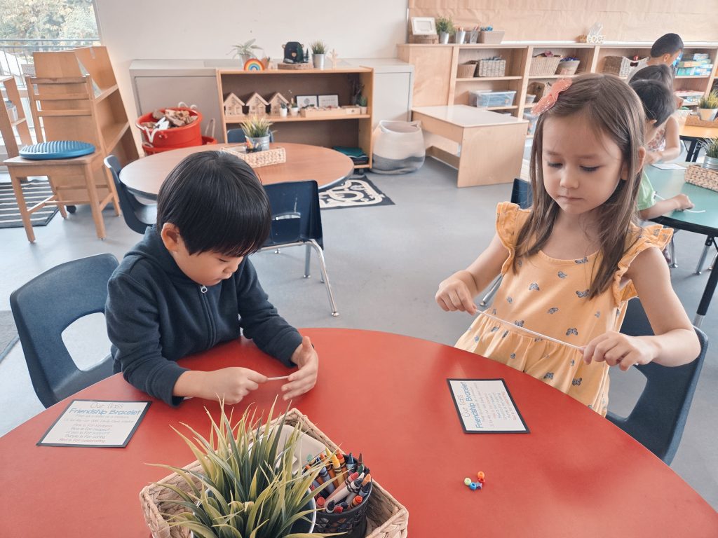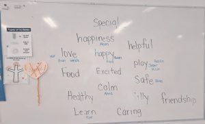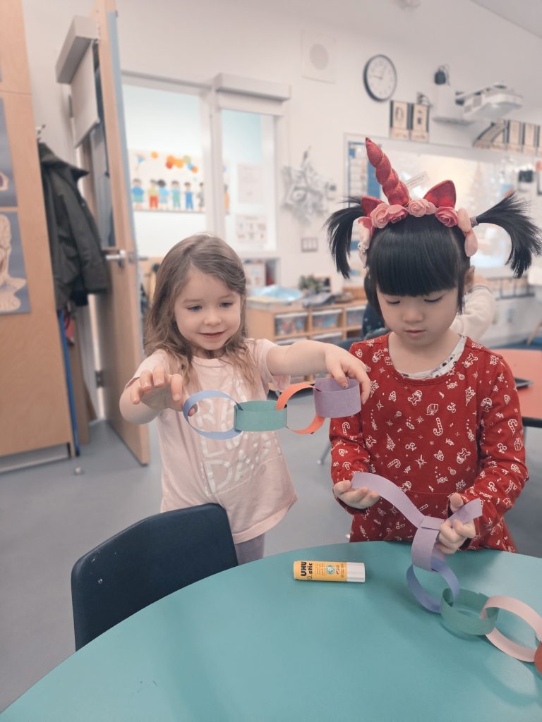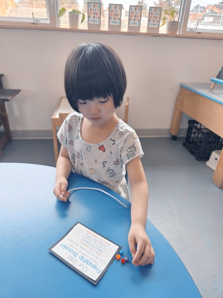 We read the book One Word for Kids, which inspired us to think about a word that will help us be our best selves this year. We brainstormed words like kind, strong, fast, love, smile, sing, family. Each child chose a word that was meaningful to them, wrote it down, and created a bracelet to wear as a reminder.
