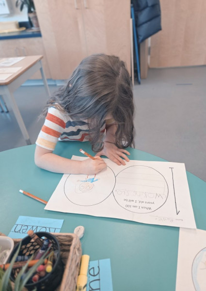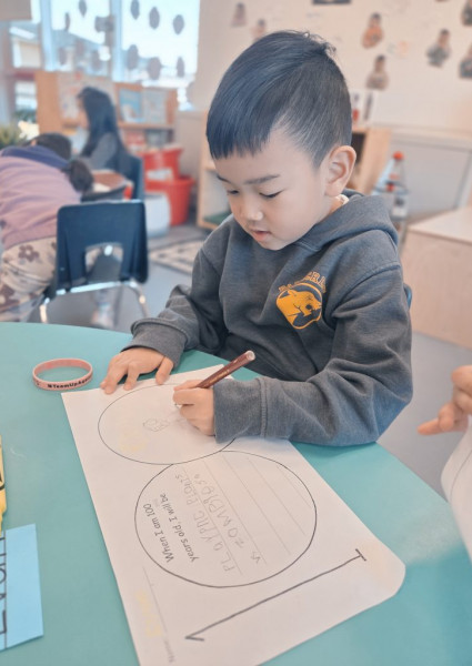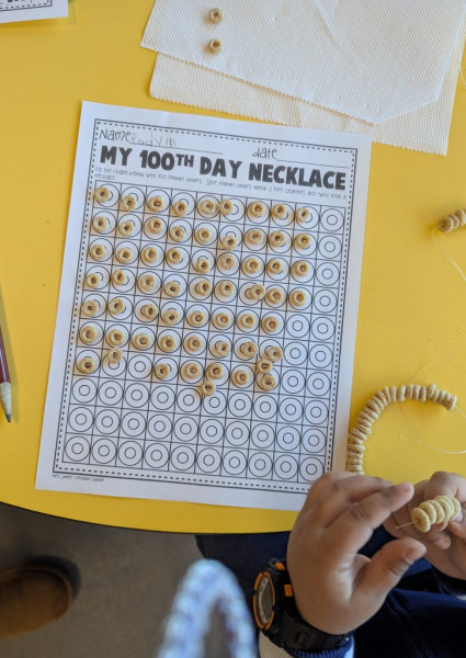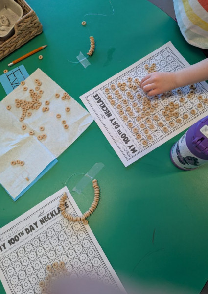 During the 100th Day of School, we jumped 100 times (over the week). We imagined what it might look like in the future when we are 100 years old! We created necklaces with 100 beads/Cheerios. We continued to explore a variety of Math and Literacy activities. We can now count by 10s to 100, and we are reading so many new words!