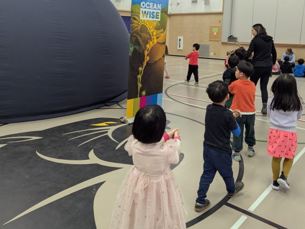 The Planetarium visited our school Gym. Ocean Wise marine educators took us into the Sea Dome, a large black dome theatre, and we had a blast watching the big screen. We learned about sea animals and protecting our waterways. The educators brought some marine artifacts and we were able to touch things like shark jaws and sea turtle shells.