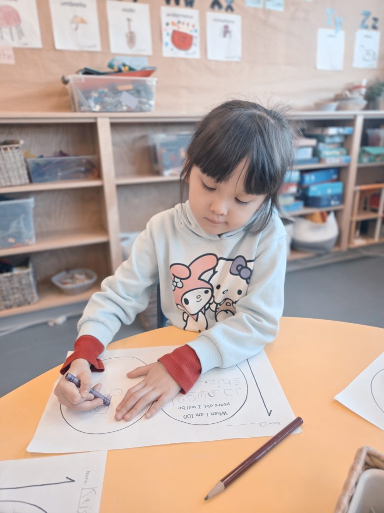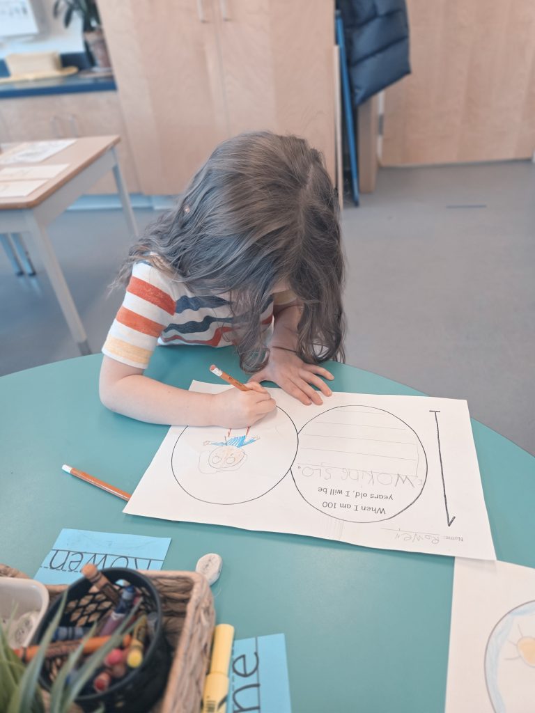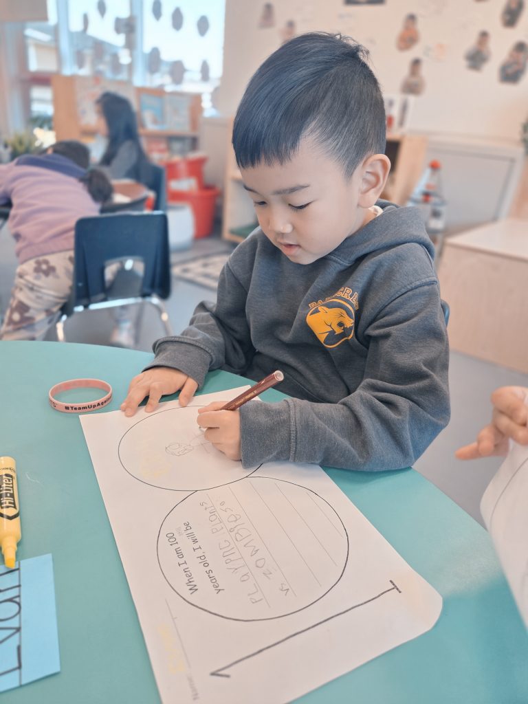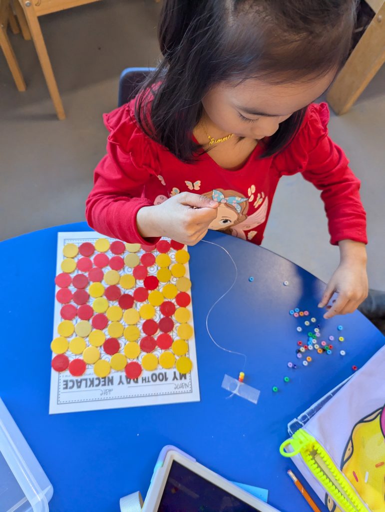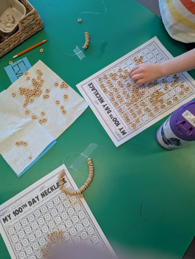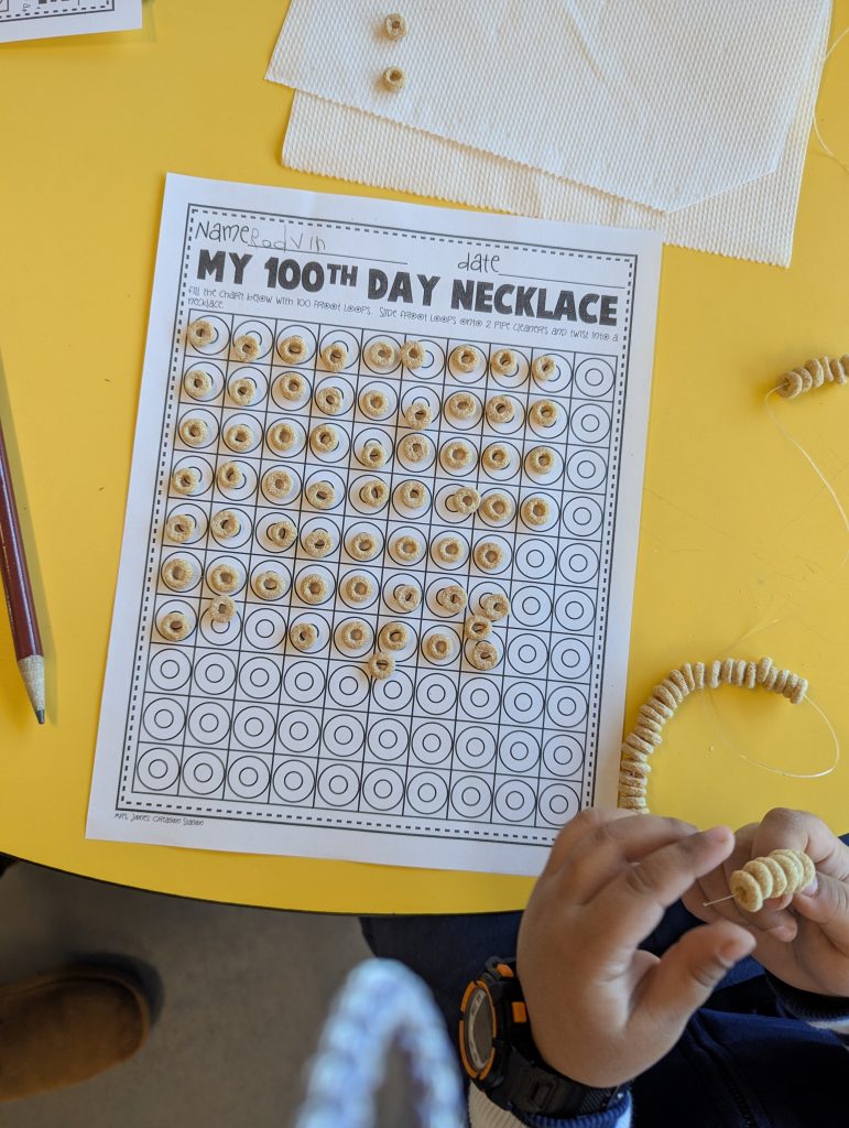 During the 100th Day of School, we jumped 100 times (over the week). We imagined what it might look like in the future when we are 100 years old! We created necklaces with 100 beads/Cheerios. We continued to explore a variety of Math and Literacy activities. We can now count by 10s to 100, and we are reading so many new words!