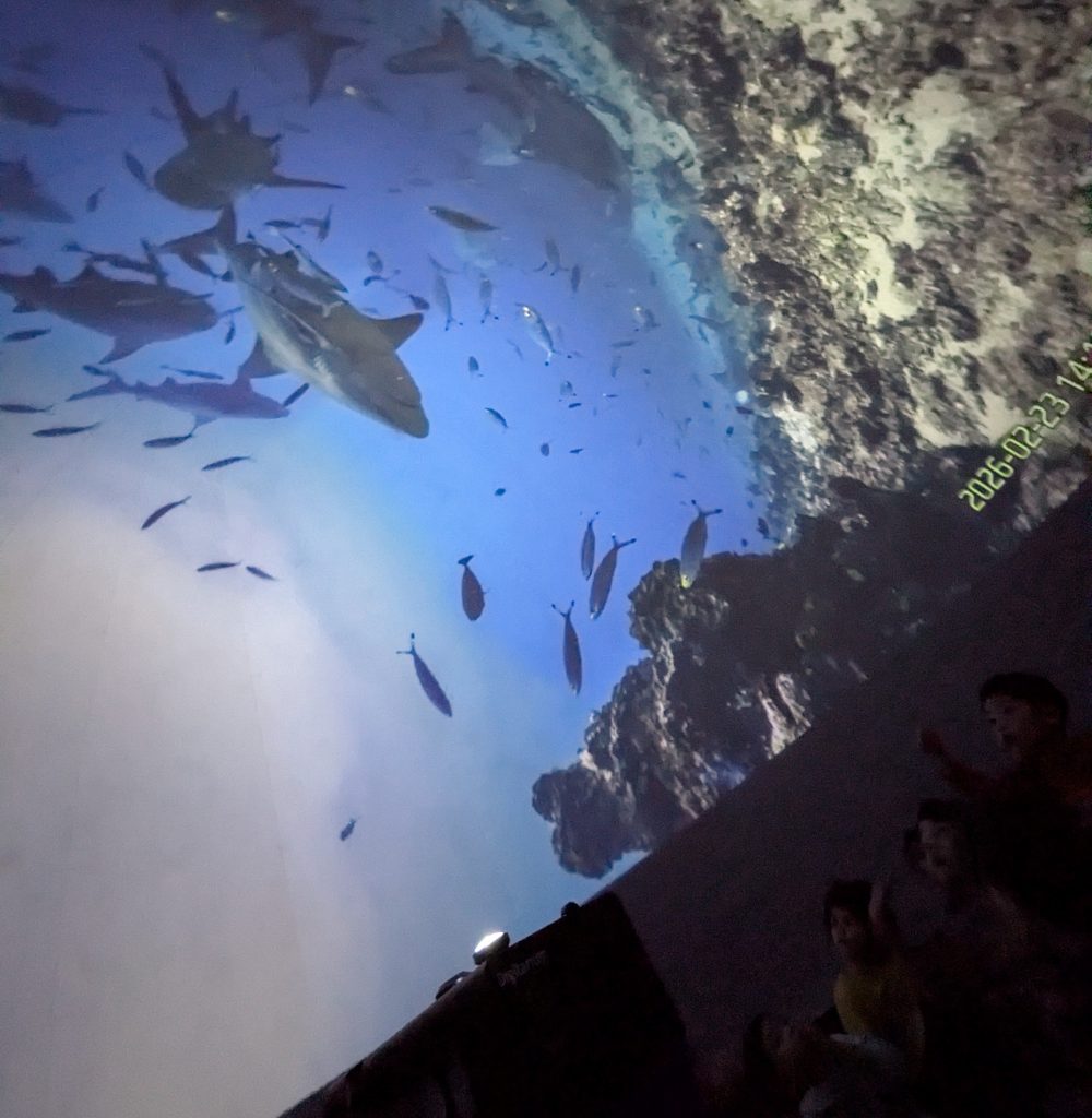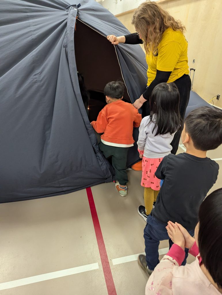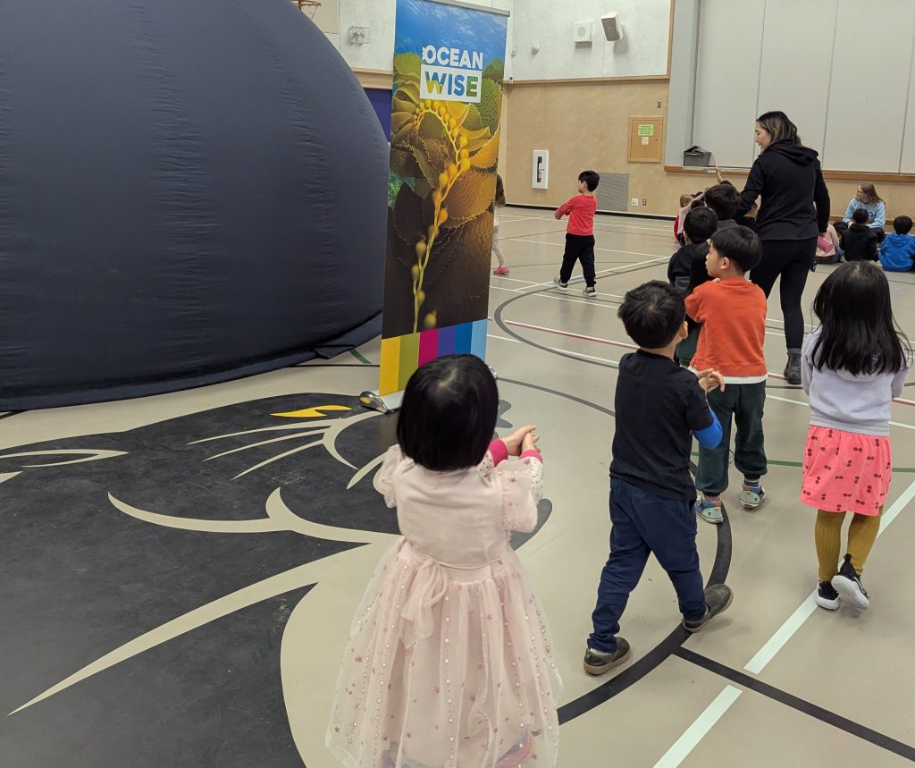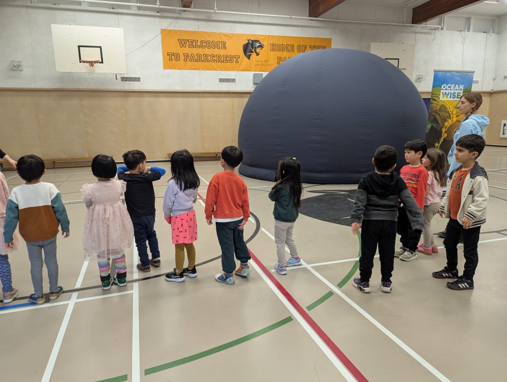 The Planetarium visited our school Gym. Ocean Wise marine educators took us into the Sea Dome, a large black dome theatre, and we had a blast watching the big screen. We learned about sea animals and protecting our waterways. The educators brought some marine artifacts and we were able to touch things like shark jaws and sea turtle shells.