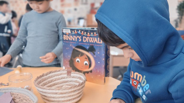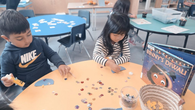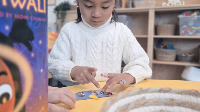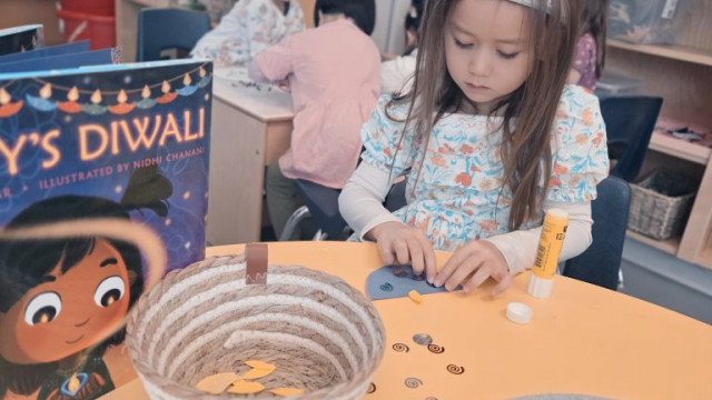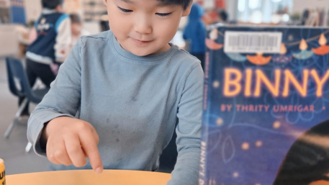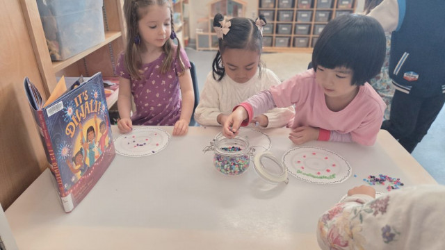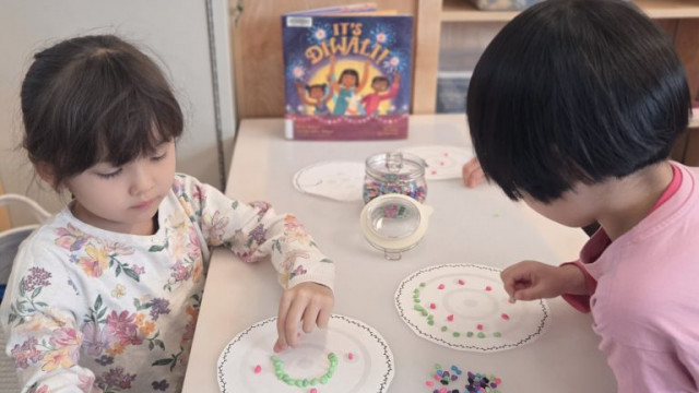 We also learned about Diwali, the Festival of Lights. The children listened to stories about how Diwali is celebrated and made colorful rangoli patterns and paper diyas to brighten our room.