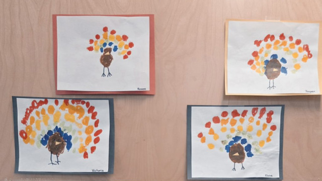 We talked about Thanksgiving—a time to be grateful and to share kindness. The class shared what they are thankful for, from family and friends to food and toys. We made “Thankful Leaves,” where each leaf showed something special that fills our hearts with gratitude. We also had fun painting rainbow turkeys for Thanksgiving!