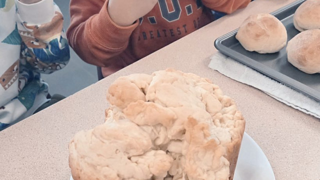 We became scientists and used our five senses to explore bread making. Div. 12 touched the dough, smelled the yeast, listened to the bubbling sounds, watched the dough rise, and of course, tasted the finished bread.