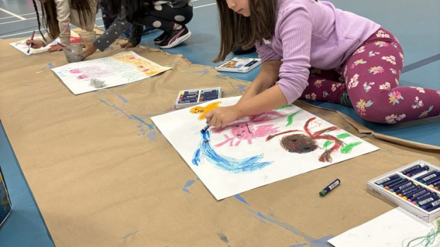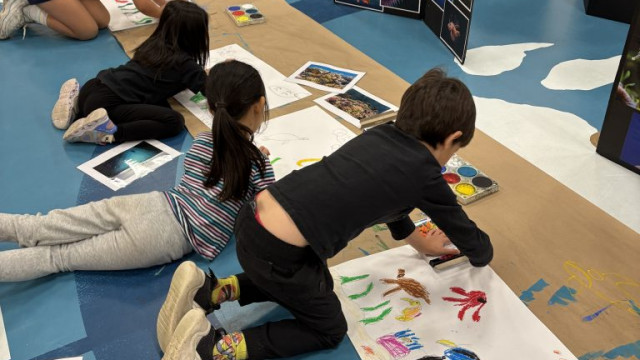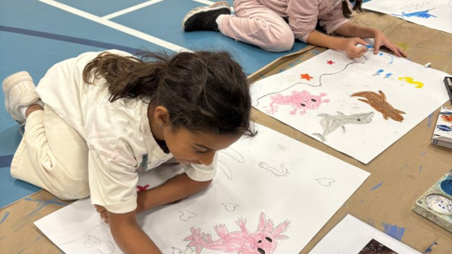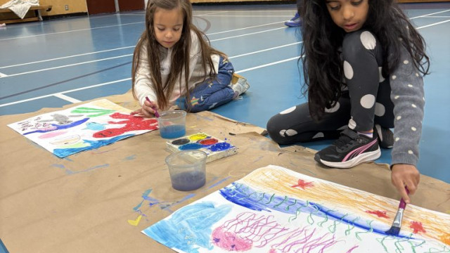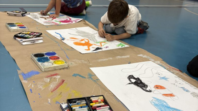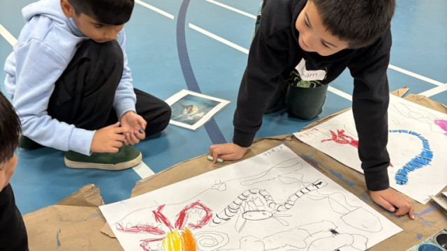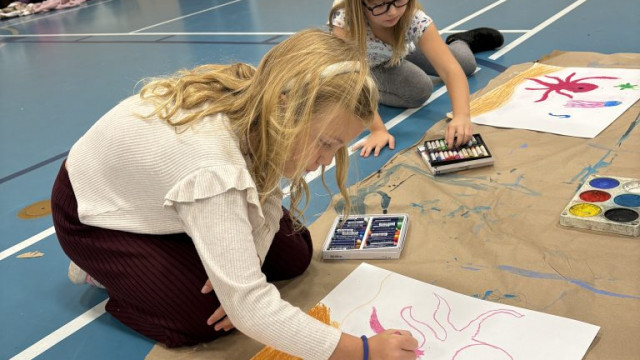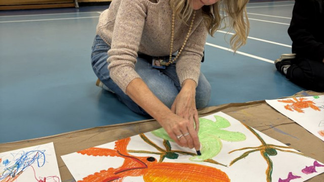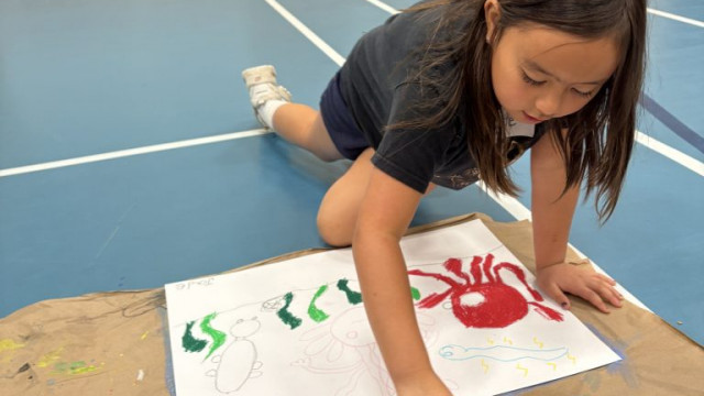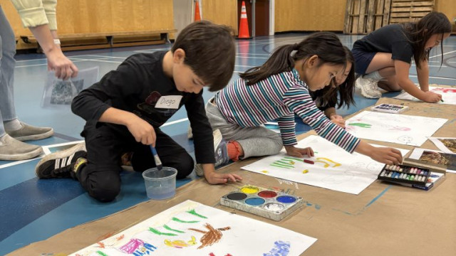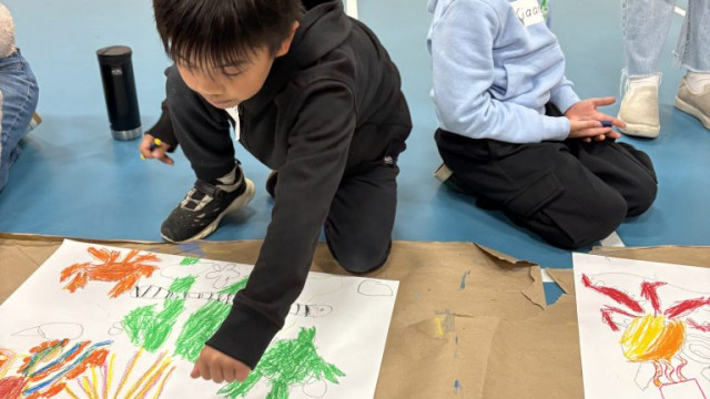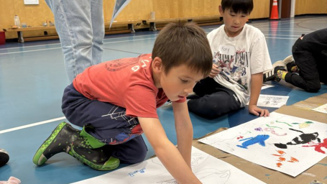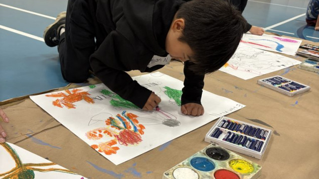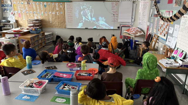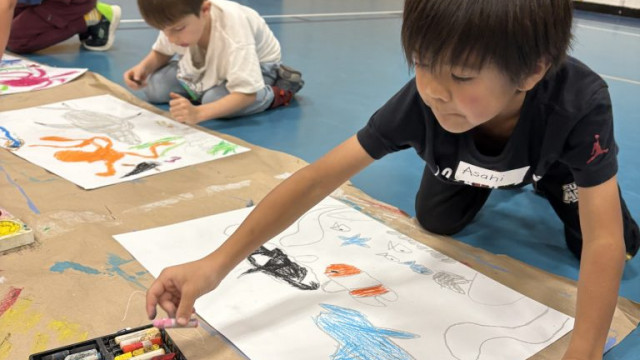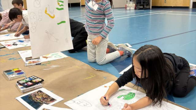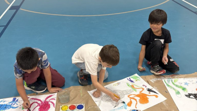 On Tuesday, Division 13 had an amazing experience with the artists from Arts Umbrella. The theme for our art was Creatures in the Ocean. Arts Umbrella had massive poster boards covered with real pictures of creatures from the sea. Sarah, the Emily Carr trained artist, taught us how to sketch the creatures using shapes. She spoke about filling our papers up with a variety of sea creatures. She also suggested that some creatures could be in the foreground and others in the background. She also taught us not to worry too much about exactly “perfecting” our sketches, as we could change them once we coloured them in. Like last week’s lesson in class for our art cards, we used pastels, but this time we used oil pastels. Sarah also spoke about layering colours on top of each other and trying to colour in the entire creature, as we were eventually going to be painting over everything with watercolour (resist). We look forward to sending home the gigantic art next week once all of our paintings have dried (some students finished their watercolour painting today.) Our art turned out amazing and we were so lucky to have had this in-school art experience!