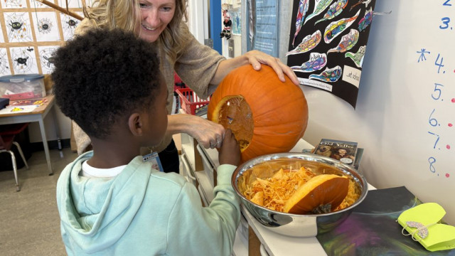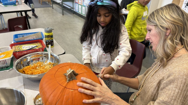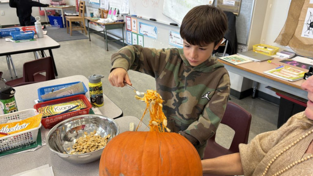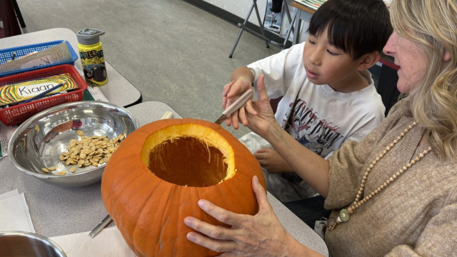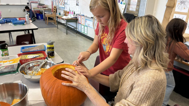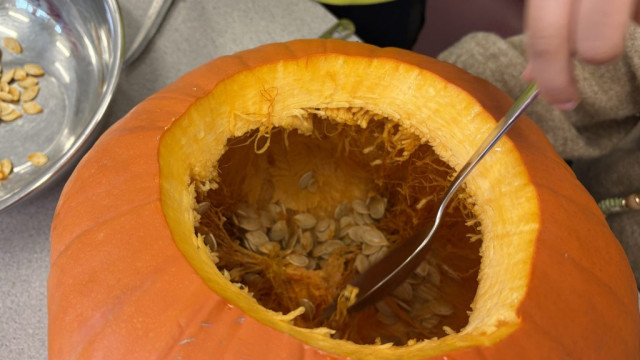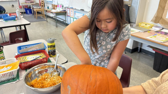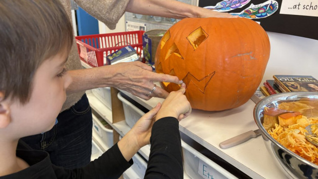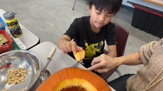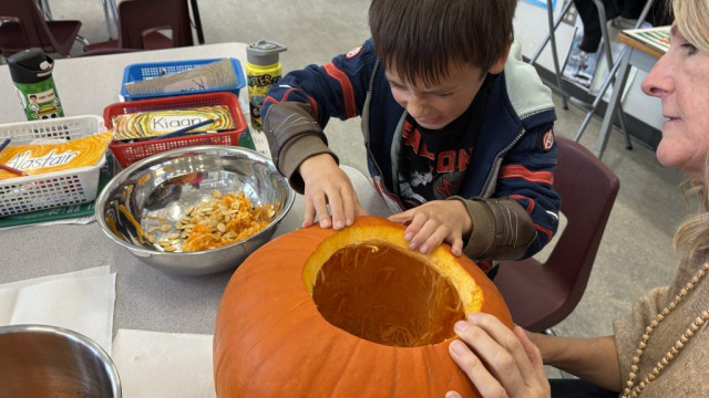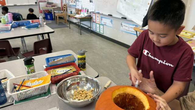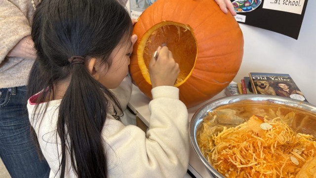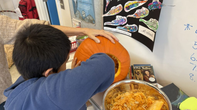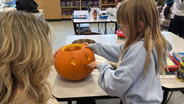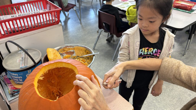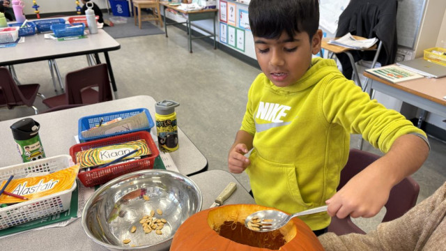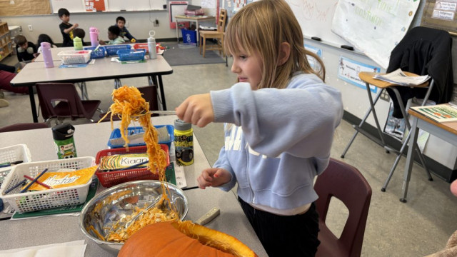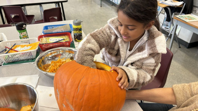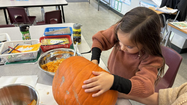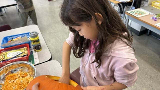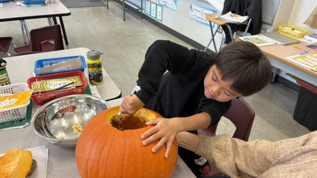 This week, Division 13 brainstormed ideas on how to carve our pumpkin and then voted for our favourite shapes. All of the students helped to carve a part of the pumpkin’s face and then worked to clean out the inside. They did a great job! It was a first time seeing inside a pumpkin for some students! We also got to enjoy the roasted pumpkin seeds during our Halloween movie afternoon. At the end of the day, we did a draw and Jane was the lucky recipient of our group pumpkin. Happy Halloween! We hope you all had a fantastic night of trick-or-treating!