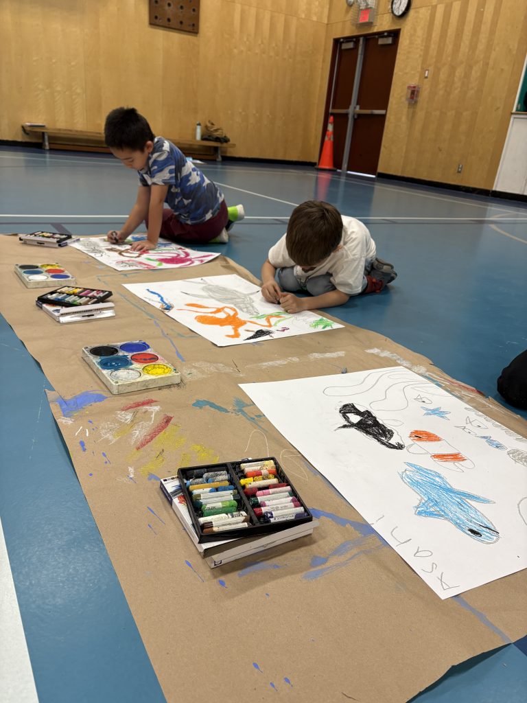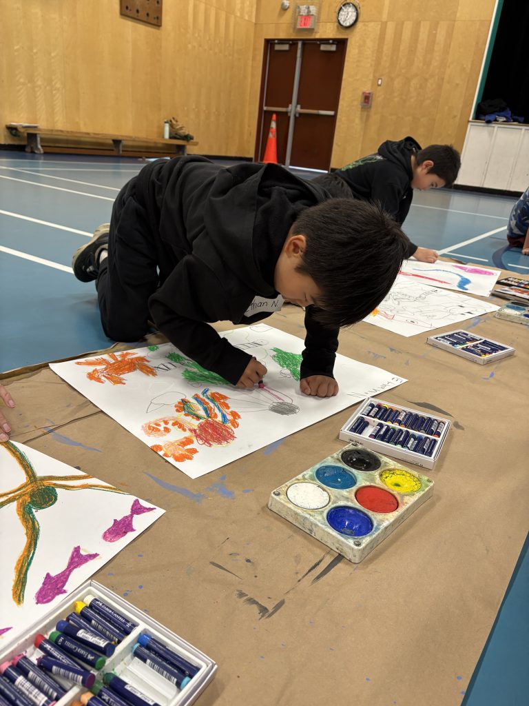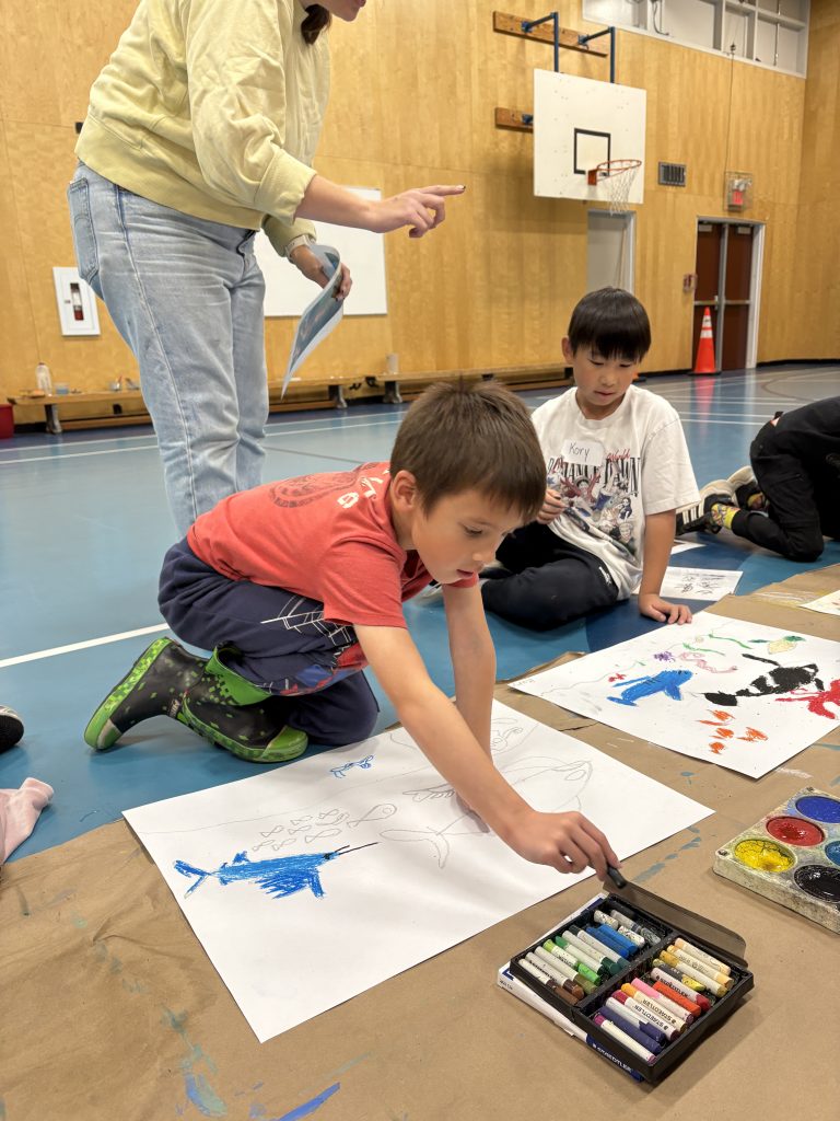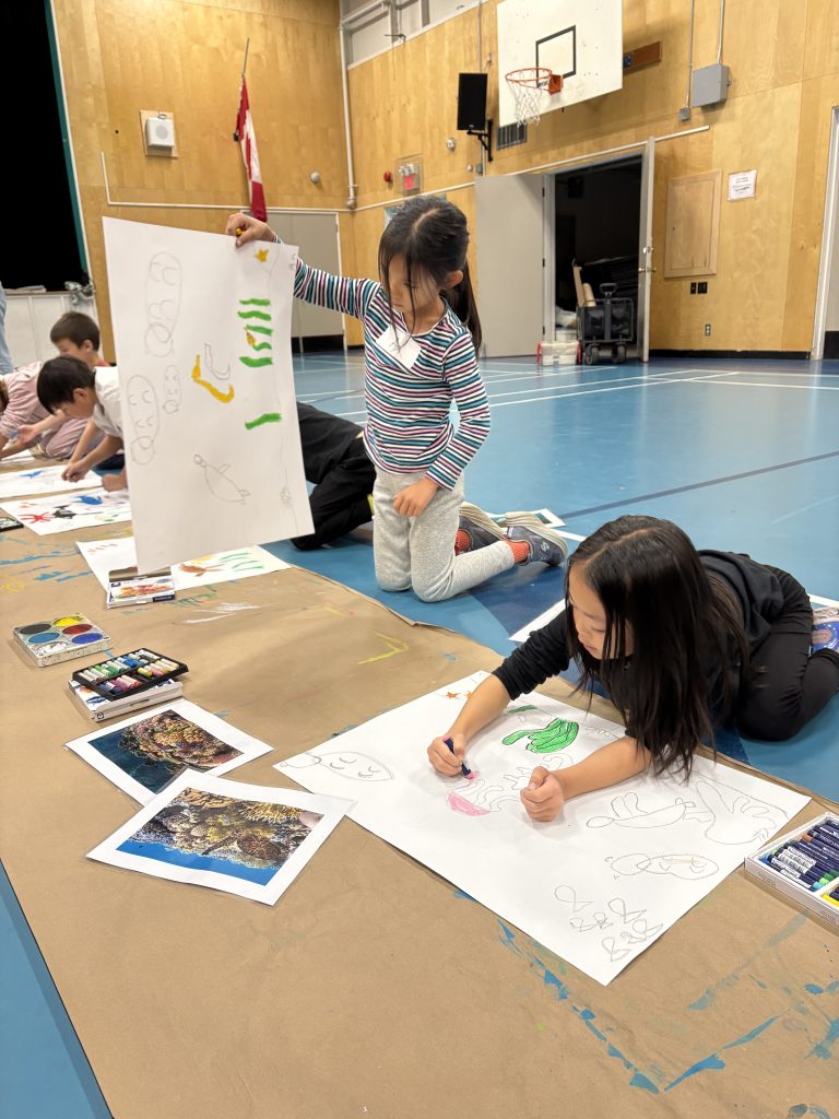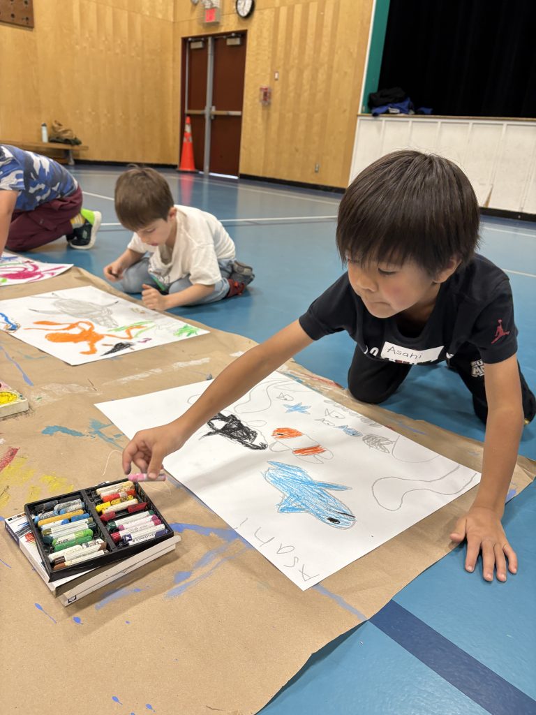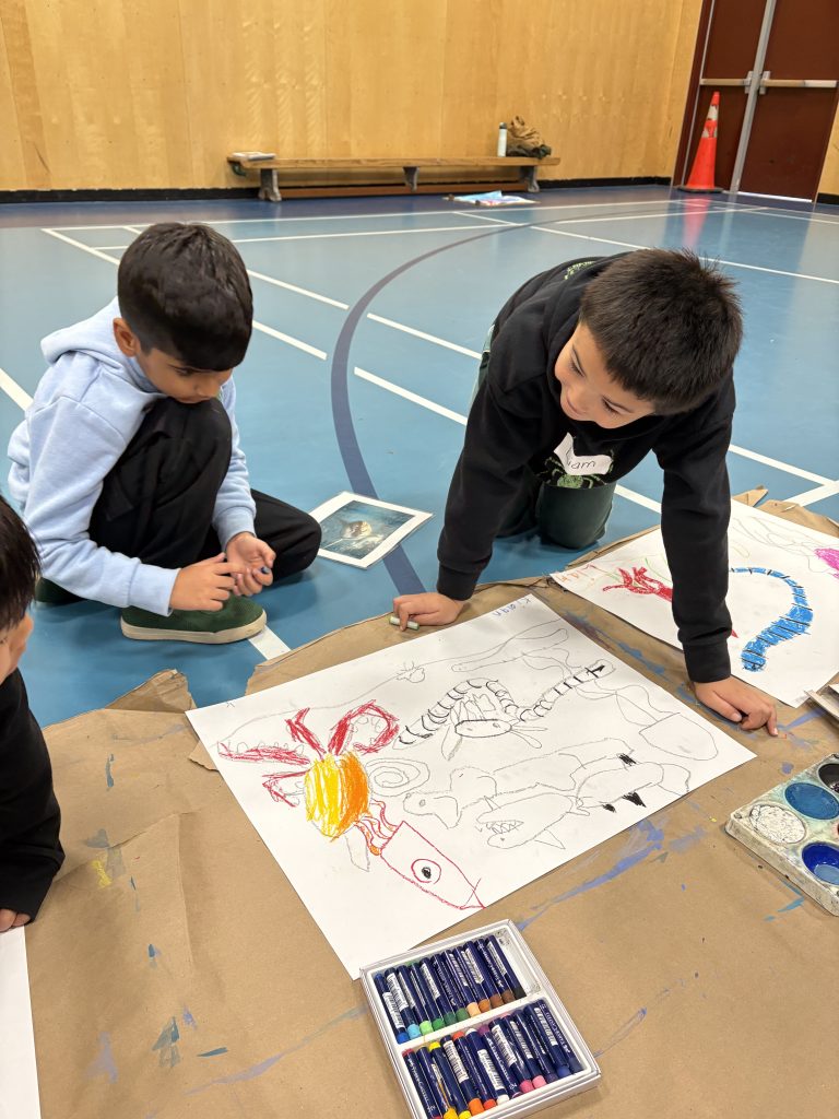 On Tuesday, Division 13 had an amazing experience with the artists from Arts Umbrella. The theme for our art was Creatures in the Ocean. Arts Umbrella had massive poster boards covered with real pictures of creatures from the sea. Sarah, the Emily Carr trained artist, taught us how to sketch the creatures using shapes. She spoke about filling our papers up with a variety of sea creatures. She also suggested that some creatures could be in the foreground and others in the background. She also taught us not to worry too much about exactly “perfecting” our sketches, as we could change them once we coloured them in. Like last week’s lesson in class for our art cards, we used pastels, but this time we used oil pastels. Sarah also spoke about layering colours on top of each other and trying to colour in the entire creature, as we were eventually going to be painting over everything with watercolour (resist). We look forward to sending home the gigantic art next week once all of our paintings have dried (some students finished their watercolour painting today.) Our art turned out amazing and we were so lucky to have had this in-school art experience!