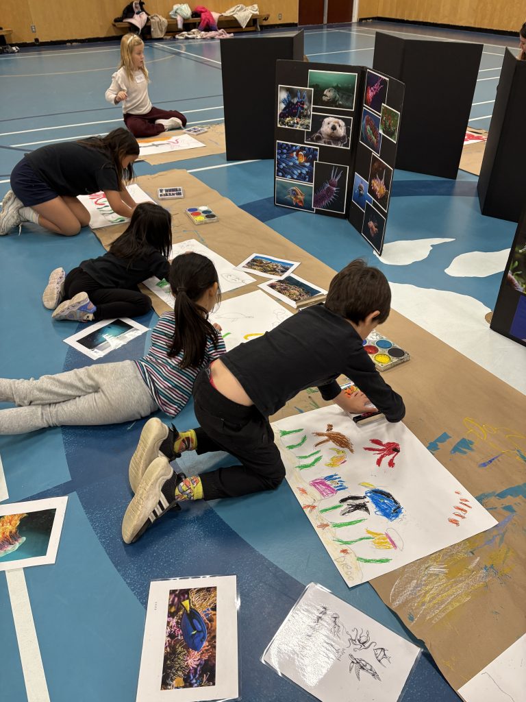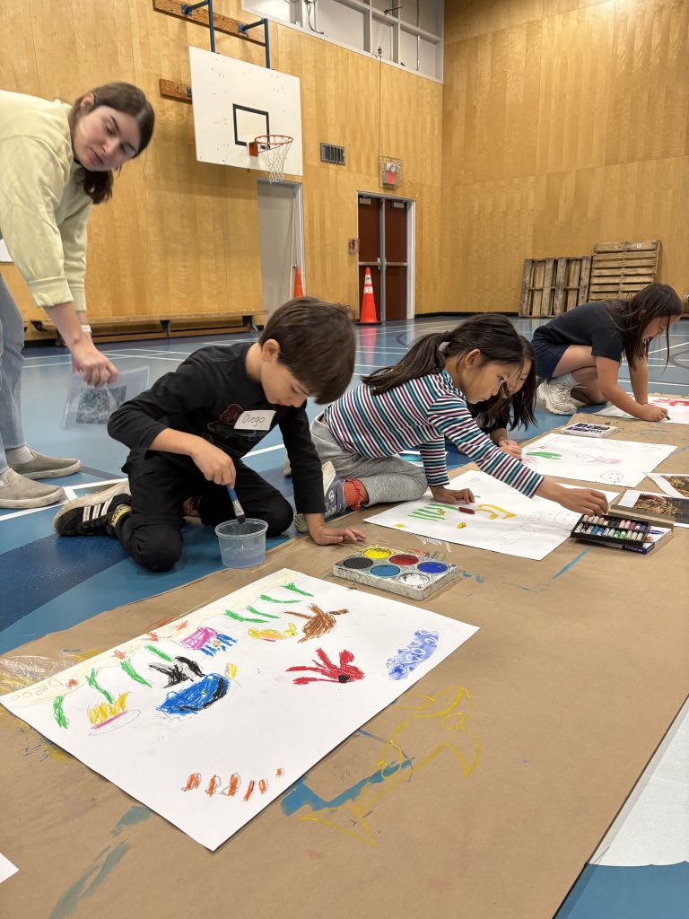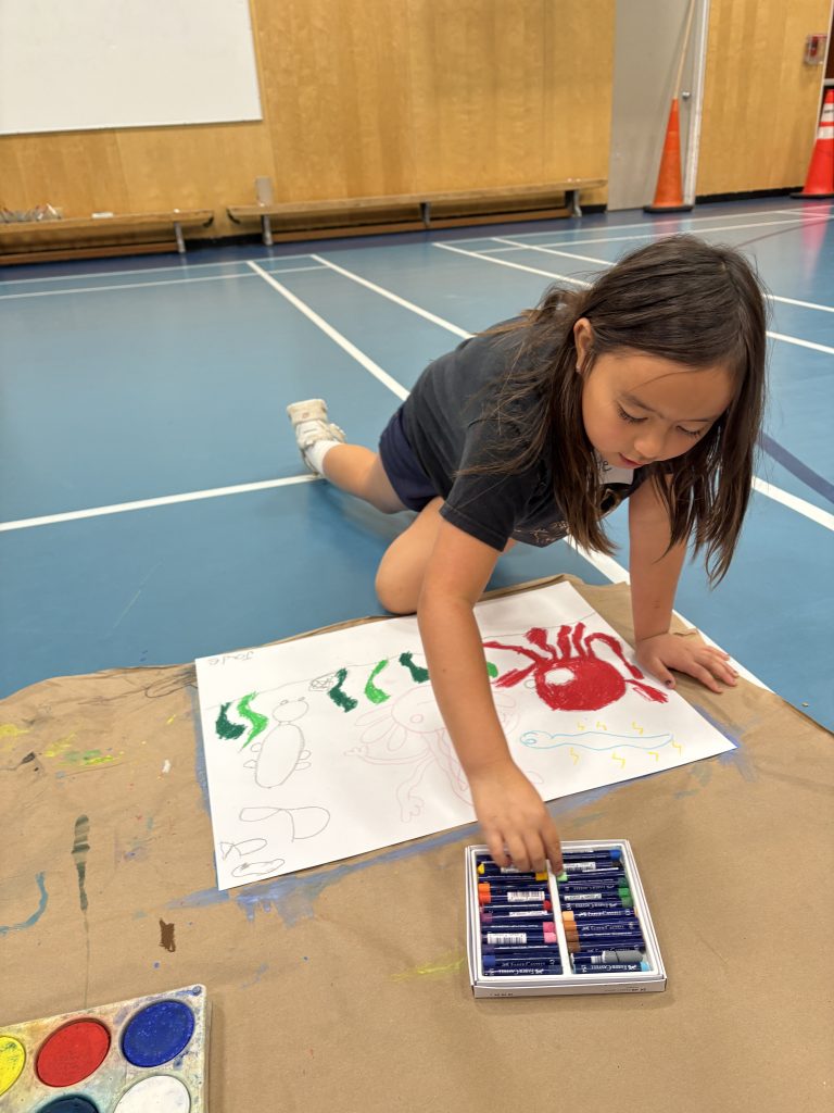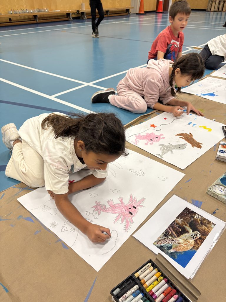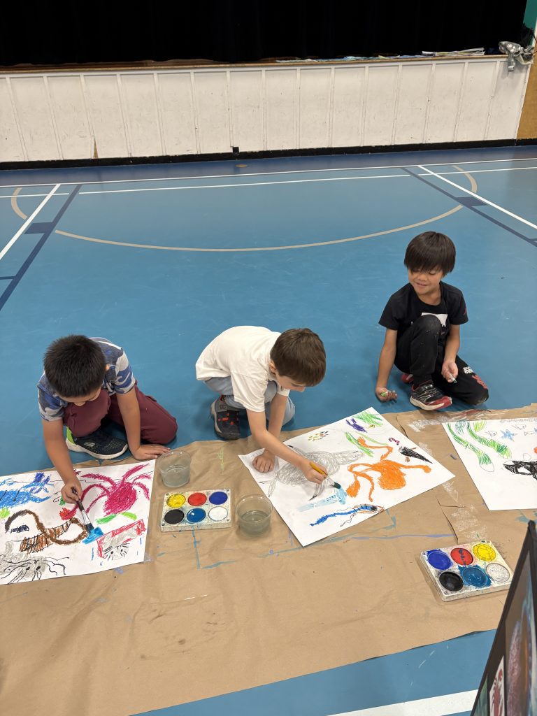 On Tuesday, Division 13 had an amazing experience with the artists from Arts Umbrella. The theme for our art was Creatures in the Ocean. Arts Umbrella had massive poster boards covered with real pictures of creatures from the sea. Sarah, the Emily Carr trained artist, taught us how to sketch the creatures using shapes. She spoke about filling our papers up with a variety of sea creatures. She also suggested that some creatures could be in the foreground and others in the background. She also taught us not to worry too much about exactly “perfecting” our sketches, as we could change them once we coloured them in. Like last week’s lesson in class for our art cards, we used pastels, but this time we used oil pastels. Sarah also spoke about layering colours on top of each other and trying to colour in the entire creature, as we were eventually going to be painting over everything with watercolour (resist). We look forward to sending home the gigantic art next week once all of our paintings have dried (some students finished their watercolour painting today.) Our art turned out amazing and we were so lucky to have had this in-school art experience!