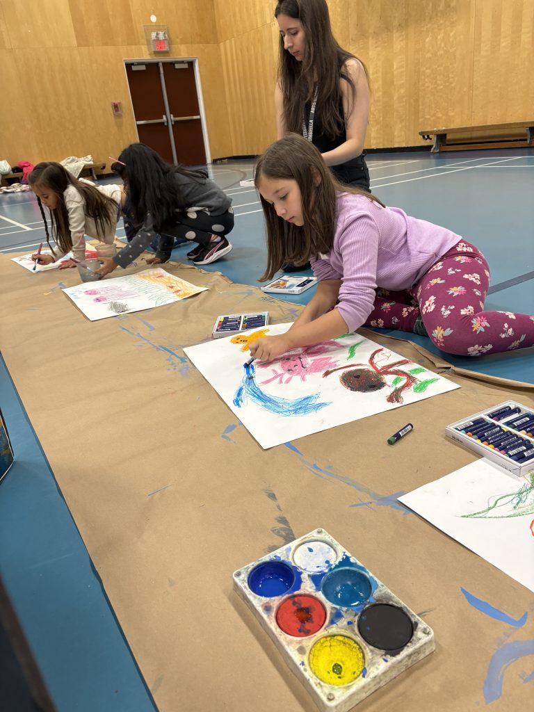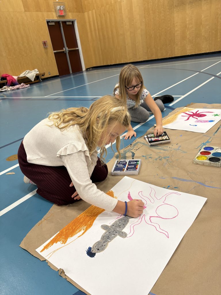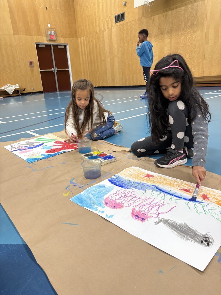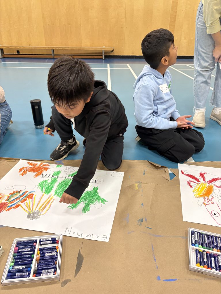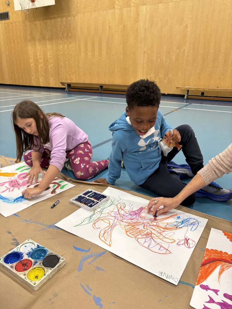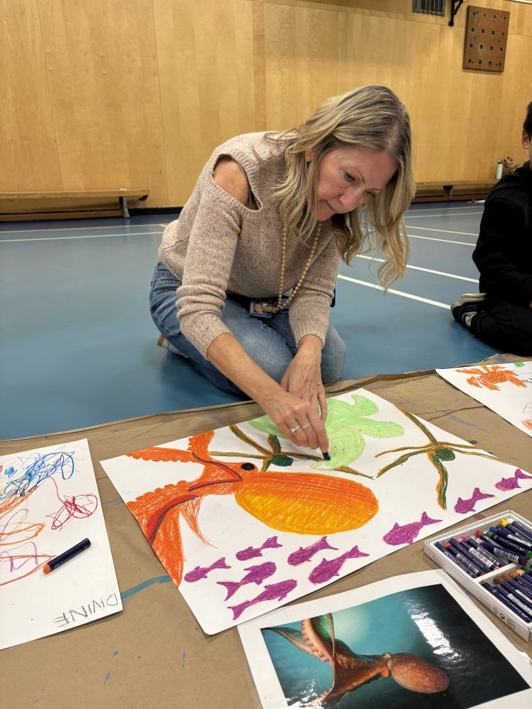 On Tuesday, Division 13 had an amazing experience with the artists from Arts Umbrella. The theme for our art was Creatures in the Ocean. Arts Umbrella had massive poster boards covered with real pictures of creatures from the sea. Sarah, the Emily Carr trained artist, taught us how to sketch the creatures using shapes. She spoke about filling our papers up with a variety of sea creatures. She also suggested that some creatures could be in the foreground and others in the background. She also taught us not to worry too much about exactly “perfecting” our sketches, as we could change them once we coloured them in. Like last week’s lesson in class for our art cards, we used pastels, but this time we used oil pastels. Sarah also spoke about layering colours on top of each other and trying to colour in the entire creature, as we were eventually going to be painting over everything with watercolour (resist). We look forward to sending home the gigantic art next week once all of our paintings have dried (some students finished their watercolour painting today.) Our art turned out amazing and we were so lucky to have had this in-school art experience!
