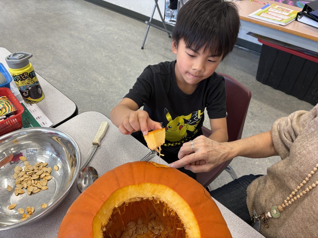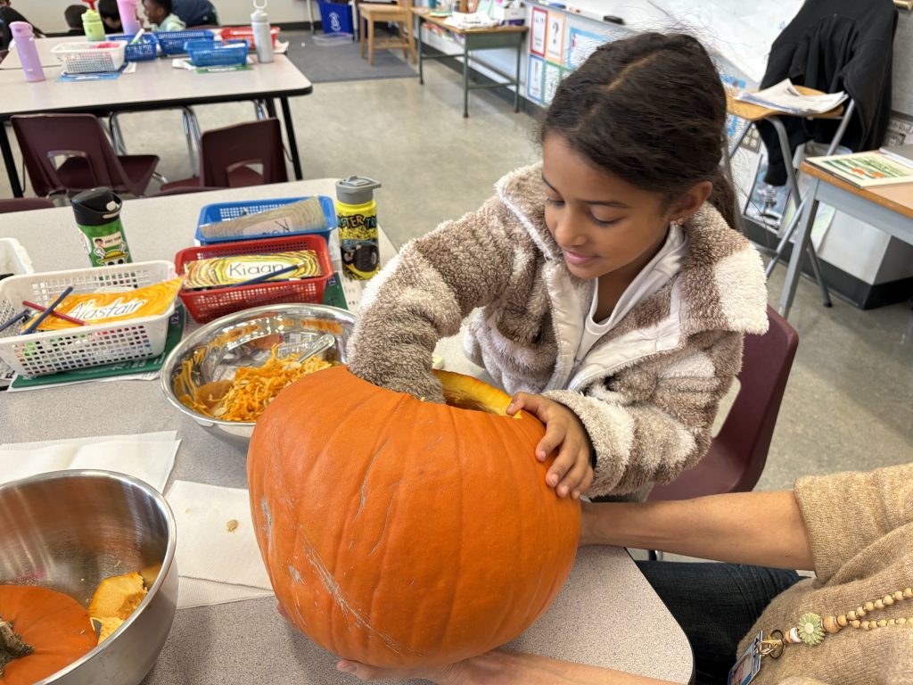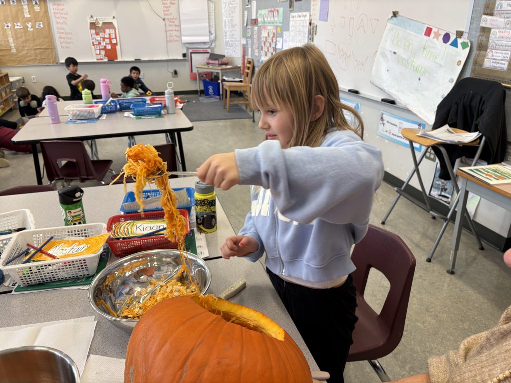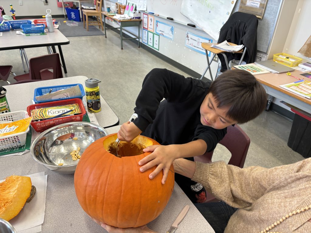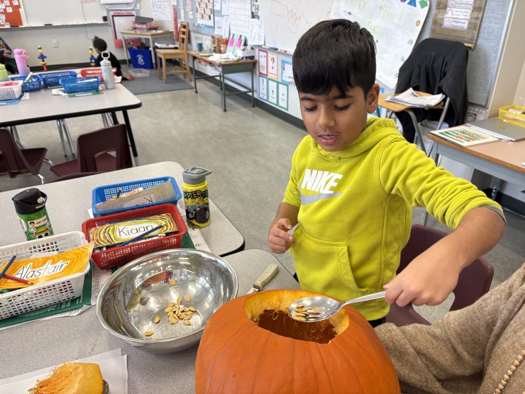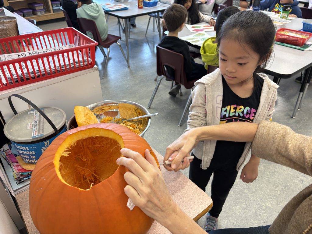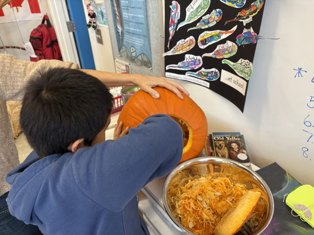 This week, Division 13 brainstormed ideas on how to carve our pumpkin and then voted for our favourite shapes. All of the students helped to carve a part of the pumpkin’s face and then worked to clean out the inside. They did a great job! It was a first time seeing inside a pumpkin for some students! We also got to enjoy the roasted pumpkin seeds during our Halloween movie afternoon. At the end of the day, we did a draw and Jane was the lucky recipient of our group pumpkin. Happy Halloween! We hope you all had a fantastic night of trick-or-treating!
