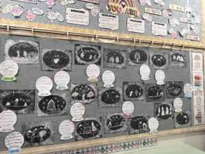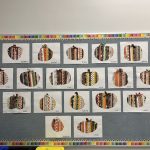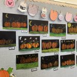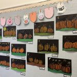 These pumpkins are created with oil pastels and the kids have created a paper pumpkin patch for our wall!