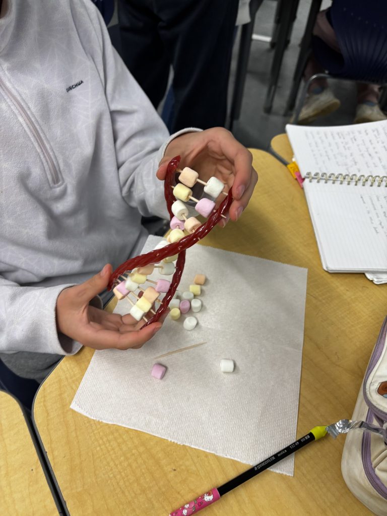 In the second session, students investigated the shape and purpose of DNA. They examined what a double helix looks like, discovered how base pairs work, and practiced sequencing. To bring the concept to life, students built edible DNA models using licorice and mini marshmallows—definitely a highlight, especially when they were allowed to eat their creations afterward!