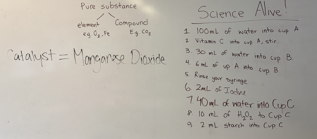 They also learned how to identify evidence of a chemical reaction, such as: colour change, formation of new substances, energy changes, and the power of catalysts (substances that speed up chemical reactions without being used up in the process).