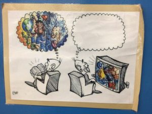 This picture is posted on my door. It is how reading uses our imagination, but television and other technology stifles creativity and imagination where everything is presented.