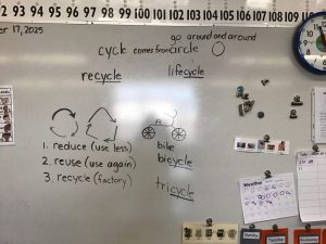 Looking closely at words is an important skill at trying to decipher or figure out what the word might mean before looking up the meaning. This is a skill that needs to be nurtured and developed by bringing attention to words rather than taking them for granted. While we were talking about recycling with respect to our environment, we looked closely at the word “recycle”. There are two parts to this word that warrant attention. “Re” is a prefix to denote “again” and the word “cycle” exists in words like bicycle, tricycle, or life cycle.