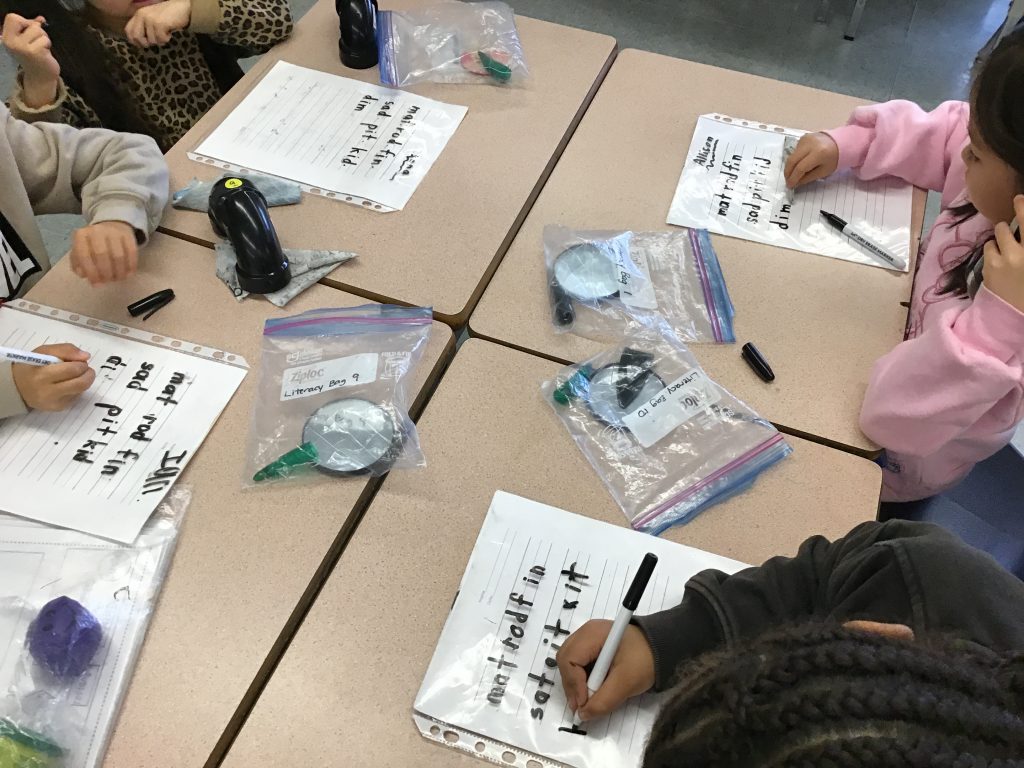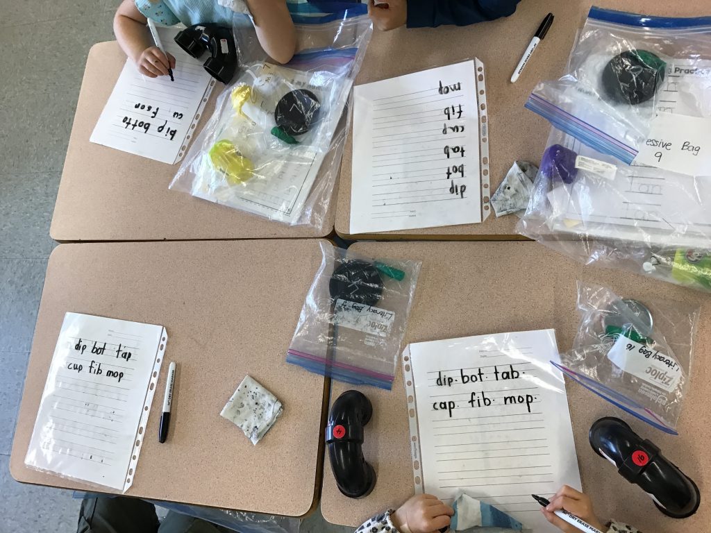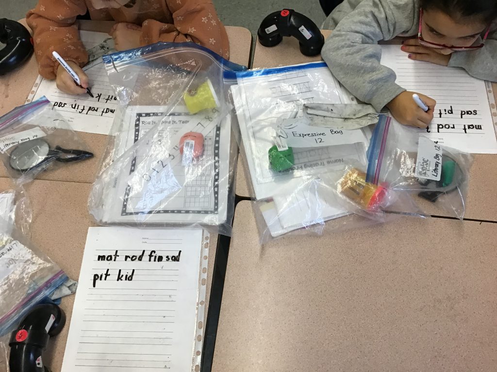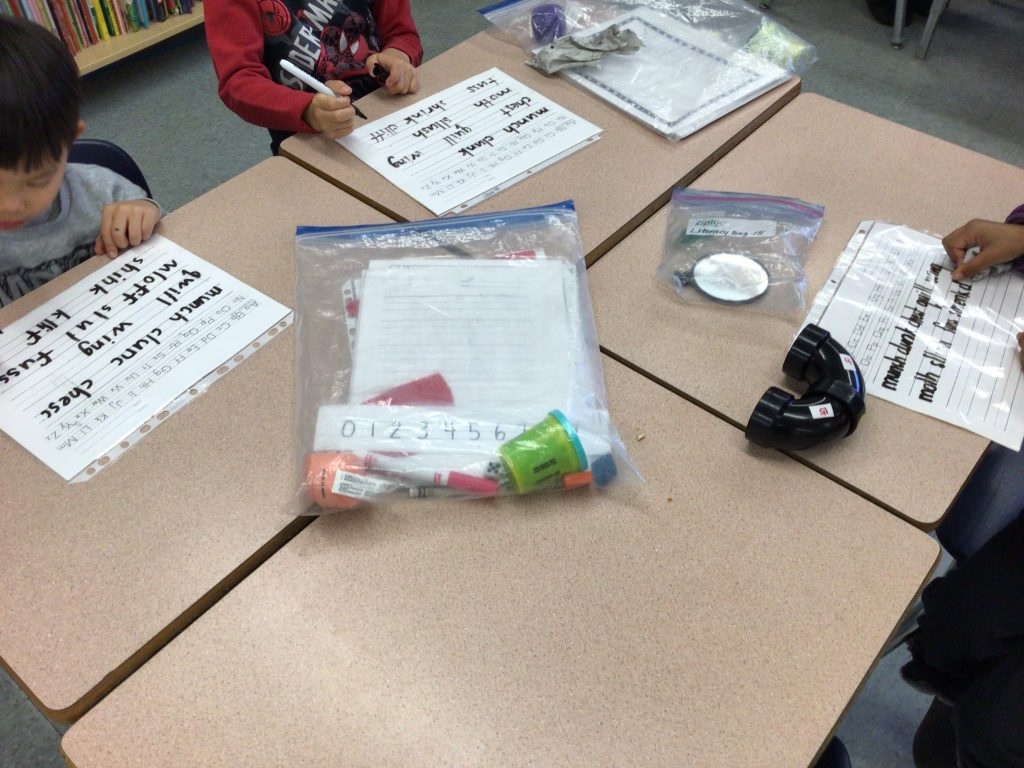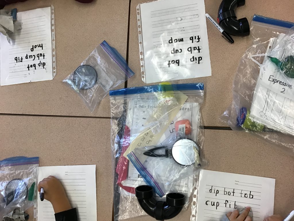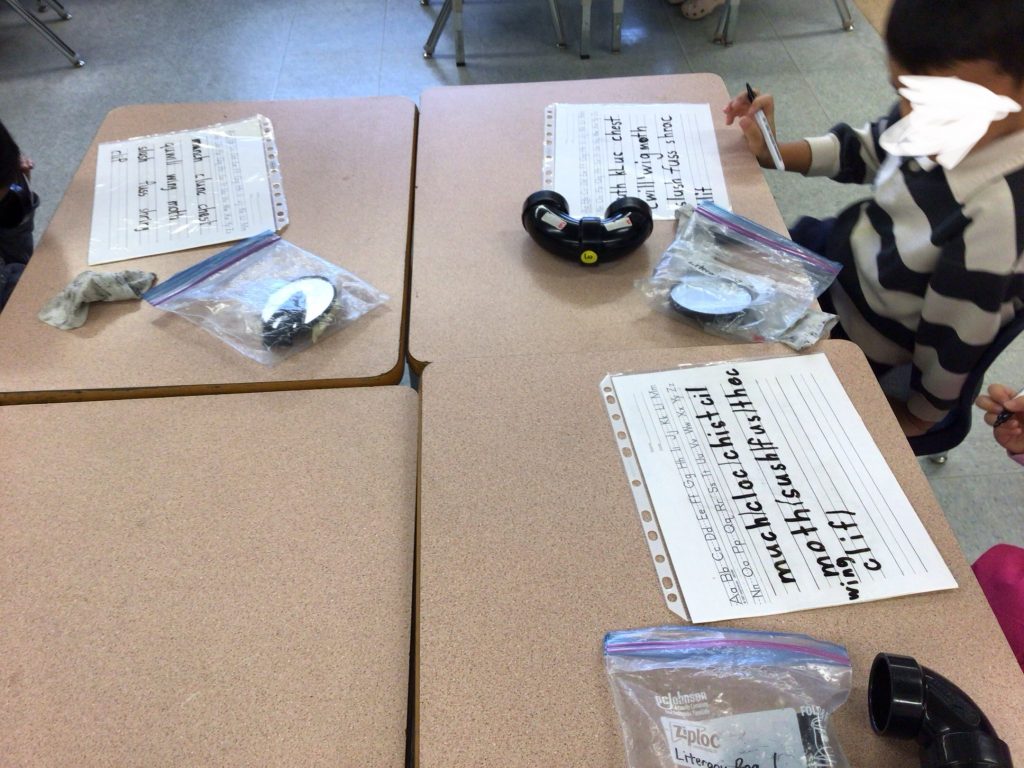 The literacy bag has a hearing phone, a mirror, and a reading finger (which will be used later in the year). The hearing phone helps to amplify the sound and the mirror helps student to ensure proper mouth formation, which include the tongue placement, lip formation, and how the air is traveling. Sometimes air comes just from our mouth making a softer sound (such as /s/ or /f/) or it comes from our lungs passing the vocal cords which make the sound louder as it vibrates through our vocal cords.