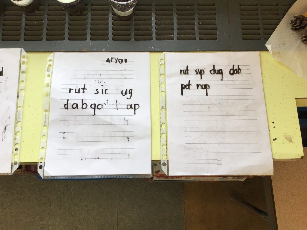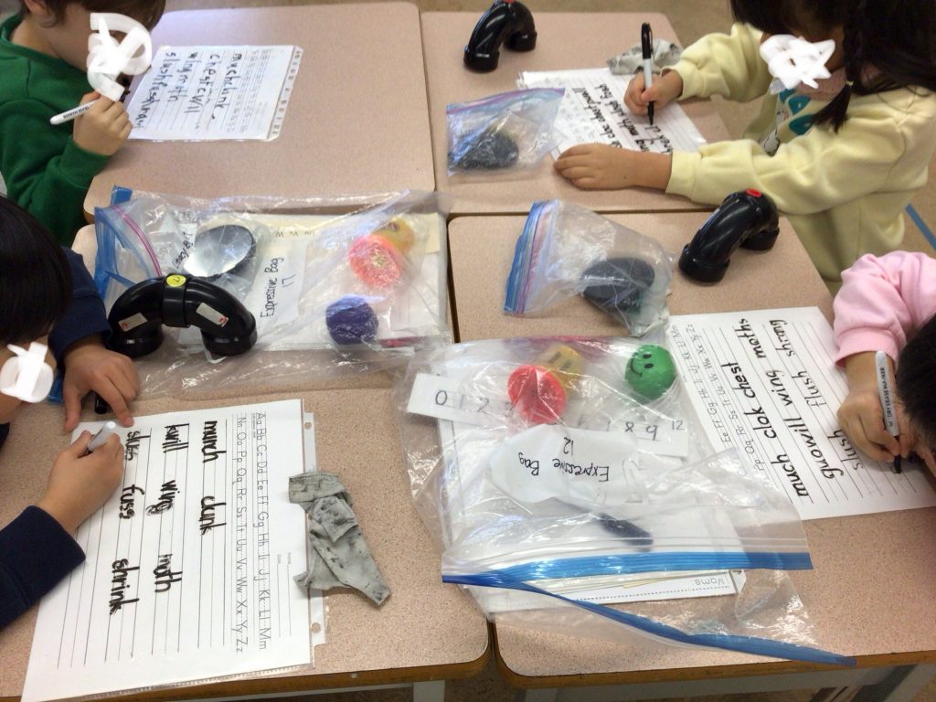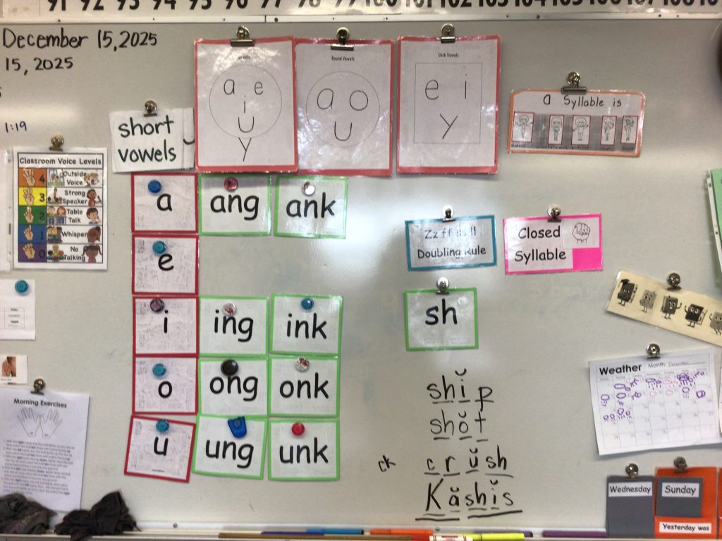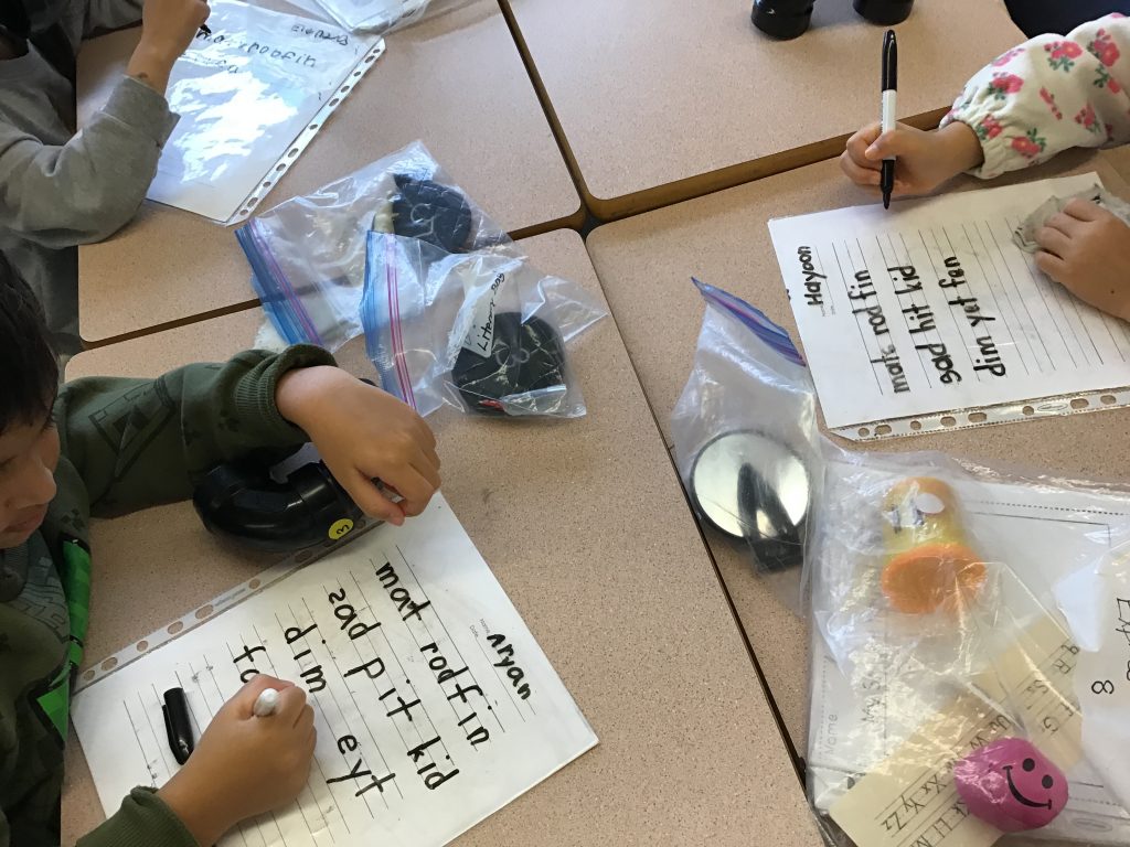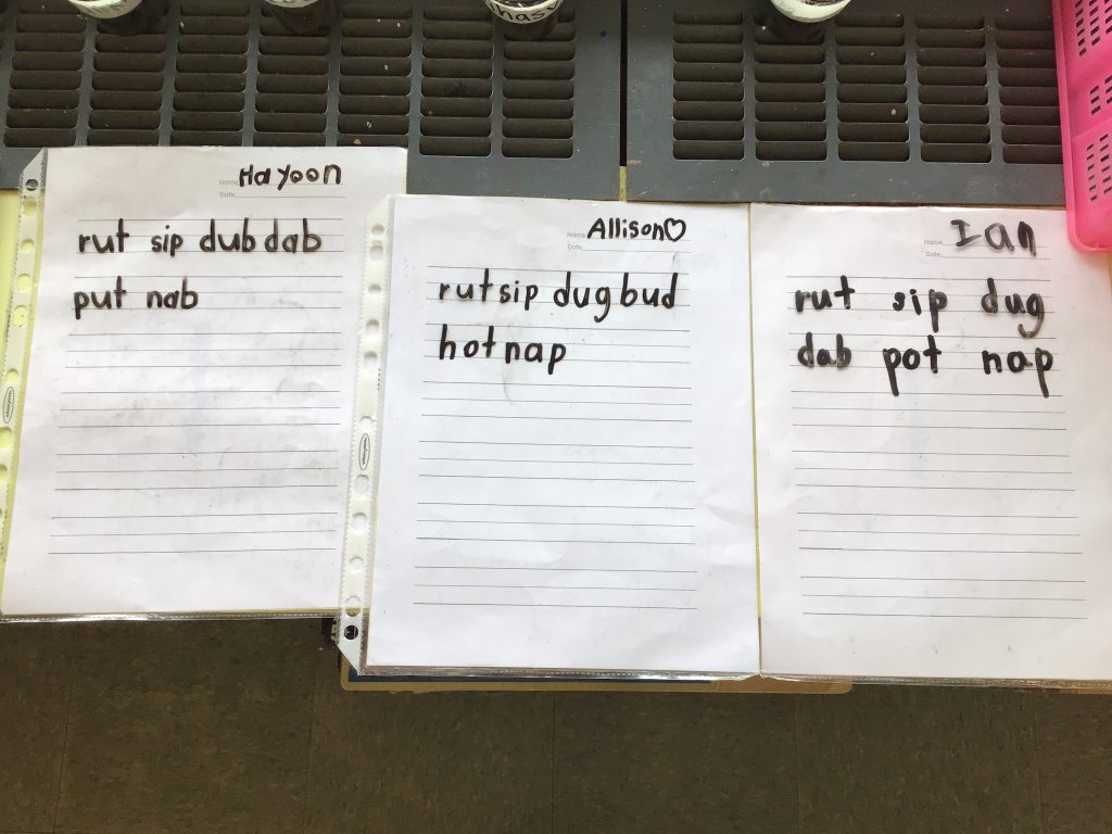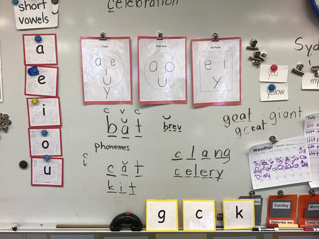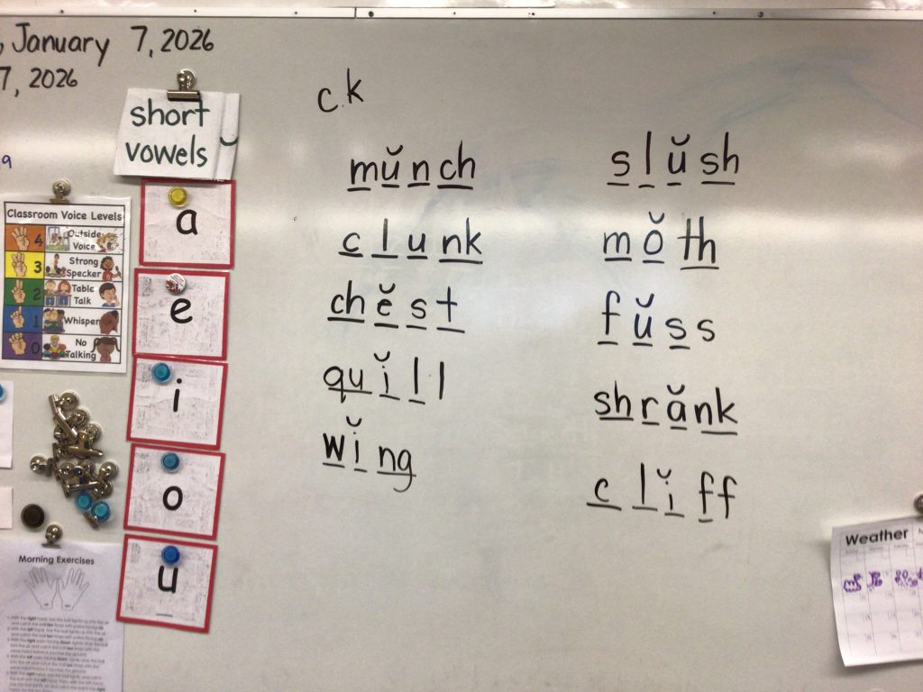During the week of Nov. 10, we learned that there are five vowels (a, e, i, o, u). There are two kinds of vowels: round vowels (a, o, u) and stick vowels (i, e, y – when y travels in the word). When we write CVC words (consonant, vowel, consonant), there is a short vowel sound in the middle. We also learned that c usually goes with the round vowels and the k usually goes with the stick vowels. We say usually because there are always exceptions in English (get, kangaroo)