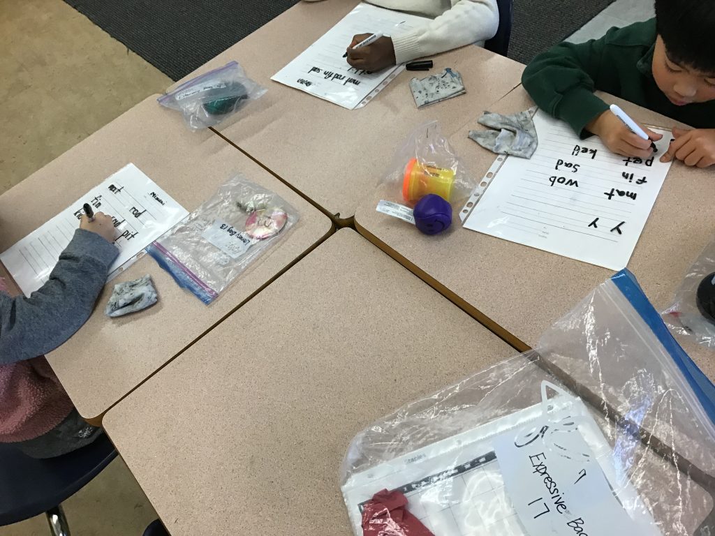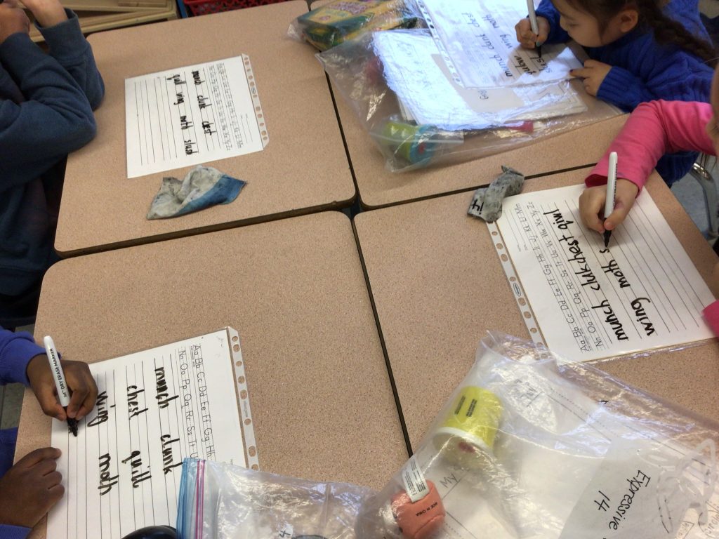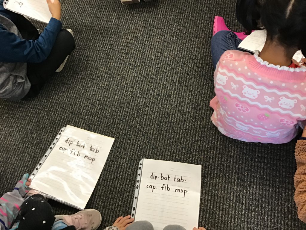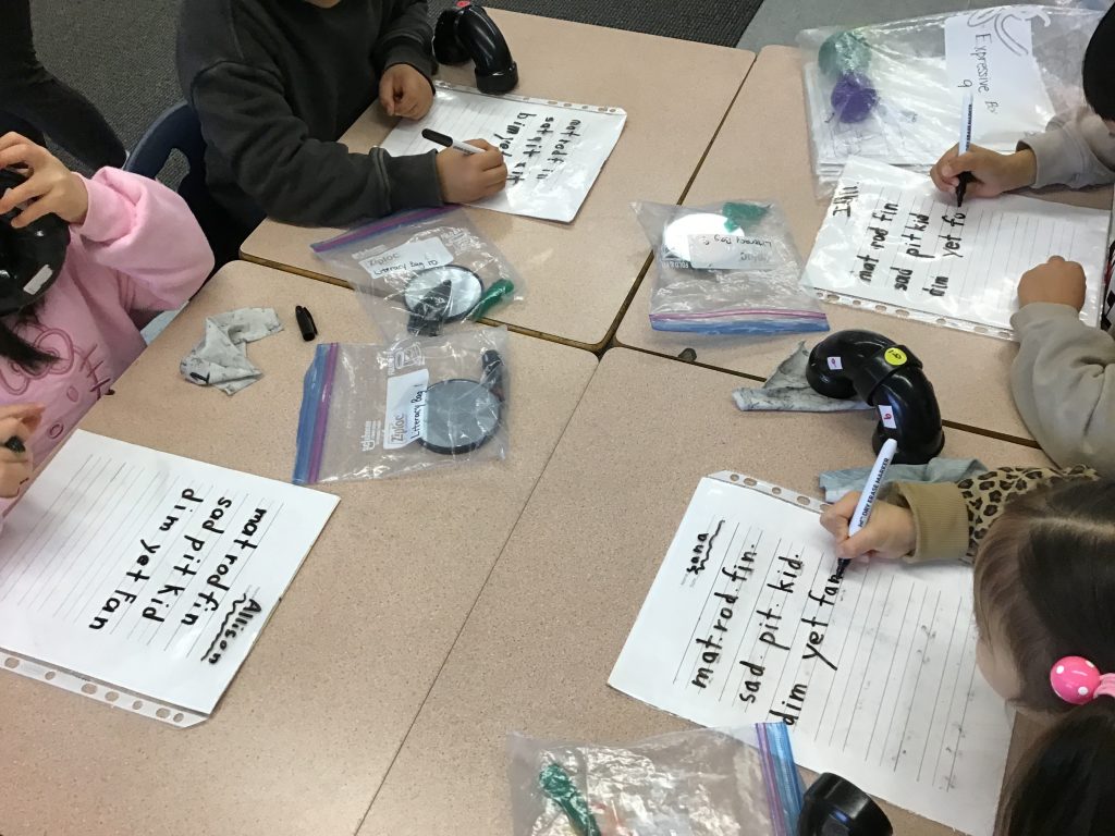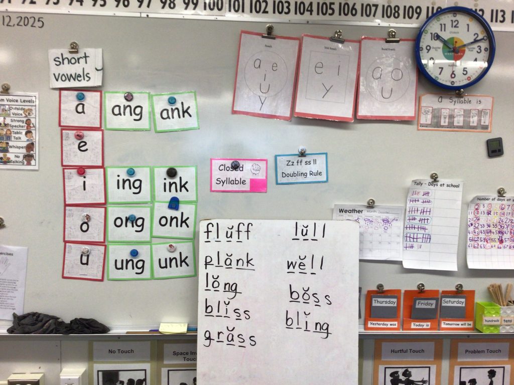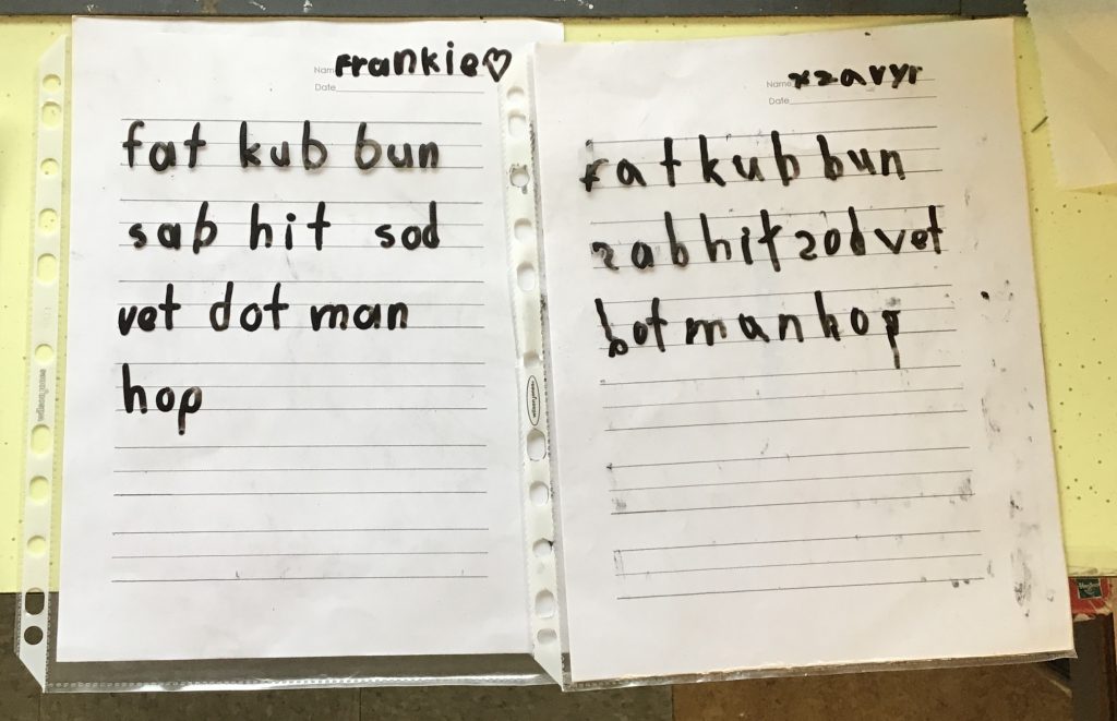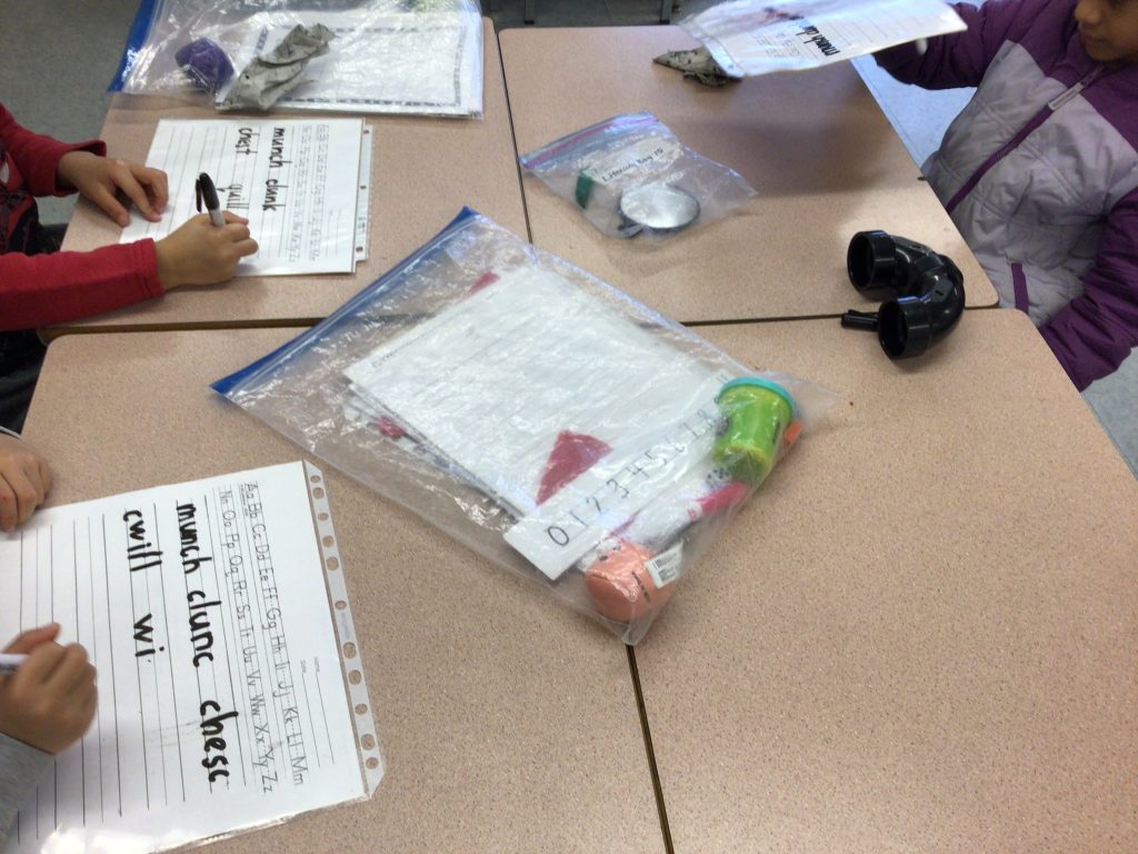 During the week of Nov. 10, we learned that there are five vowels (a, e, i, o, u). There are two kinds of vowels: round vowels (a, o, u) and stick vowels (i, e, y – when y travels in the word). When we write CVC words (consonant, vowel, consonant), there is a short vowel sound in the middle. We also learned that c usually goes with the round vowels and the k usually goes with the stick vowels. We say usually because there are always exceptions in English (get, kangaroo)