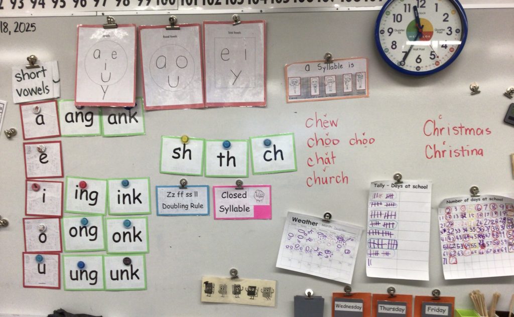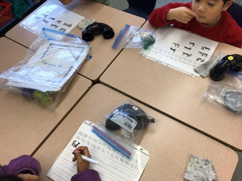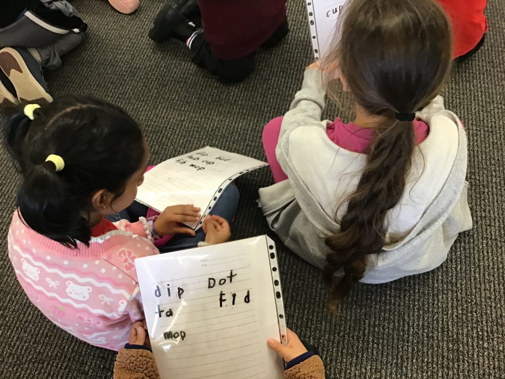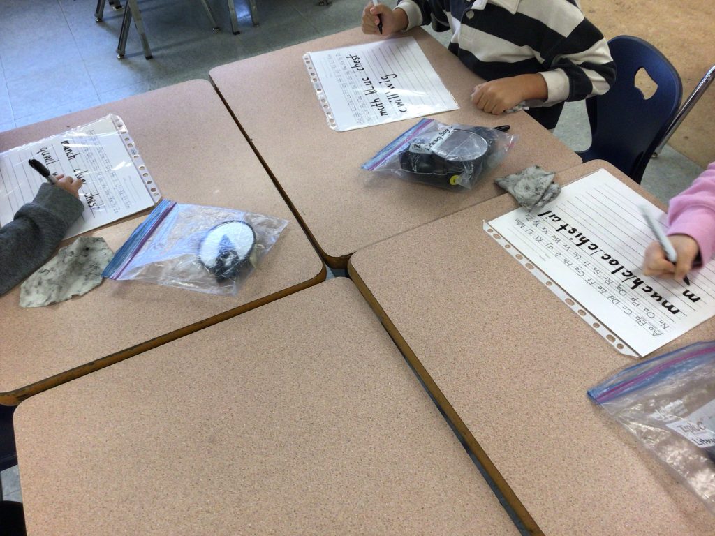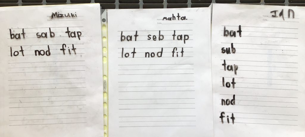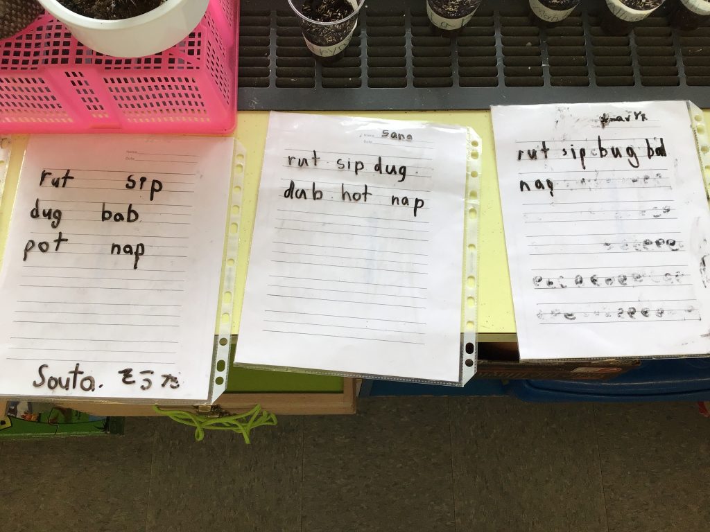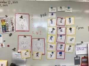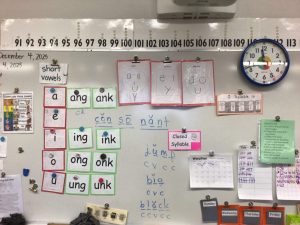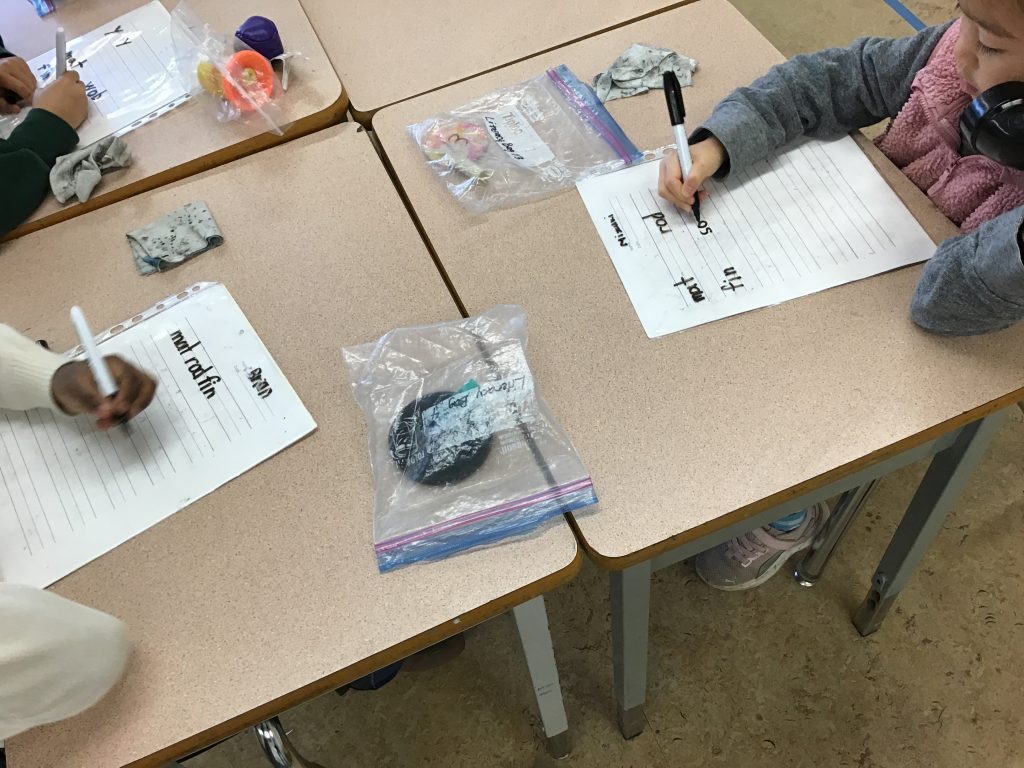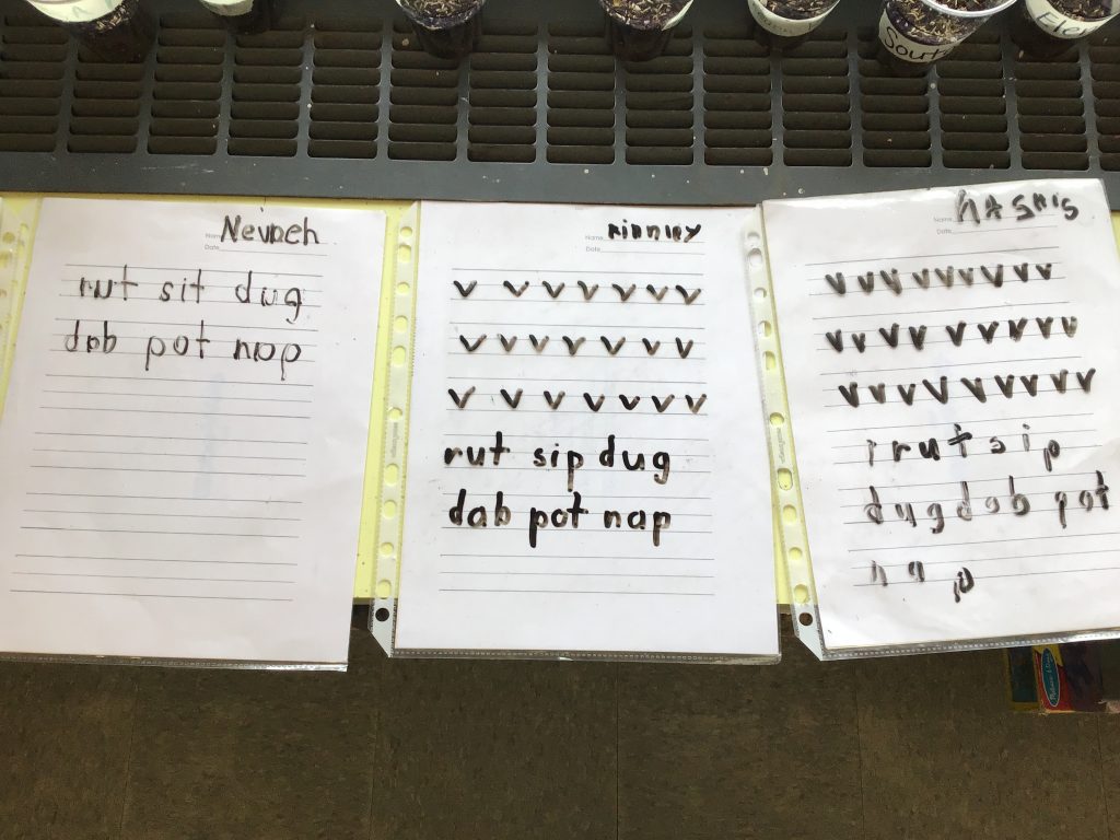 During the week of Nov. 10, we learned that there are five vowels (a, e, i, o, u). There are two kinds of vowels: round vowels (a, o, u) and stick vowels (i, e, y – when y travels in the word). When we write CVC words (consonant, vowel, consonant), there is a short vowel sound in the middle. We also learned that c usually goes with the round vowels and the k usually goes with the stick vowels. We say usually because there are always exceptions in English (get, kangaroo)