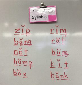 - Closed Syllable – the symbol that we use with our hand is a closed fist with our thumb inside, like it is protected by the fingers. (a closed syllable is a word or syllable where the short vowel is protected by one or more consonants such as ‘cvc’ or ‘cvcc’. Examples would be cat, bend, fling, toss, or sprung.) ‘cvc’ is consonant vowel consonant, and ‘cvcc’ is consonant vowel consonant consonant