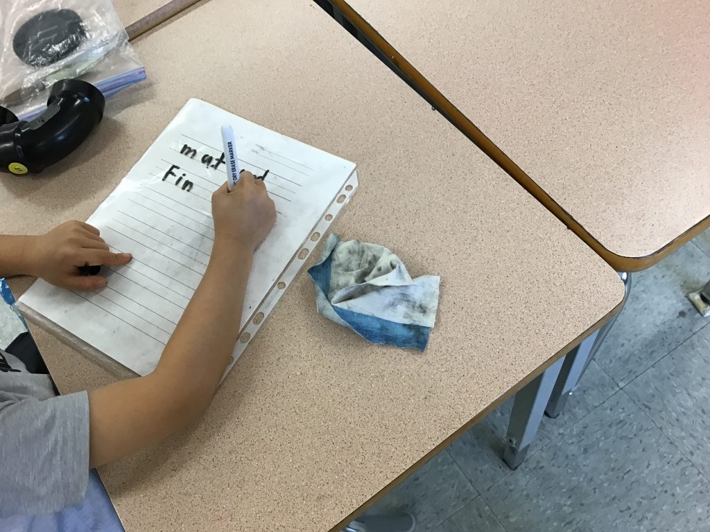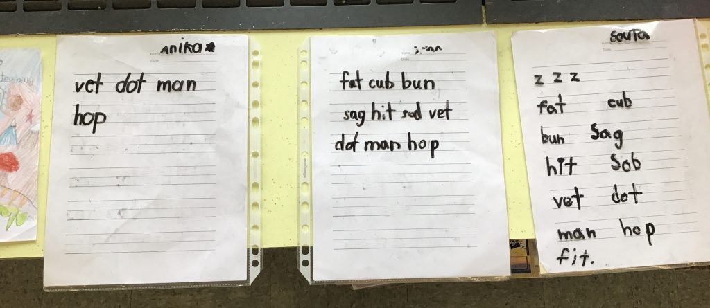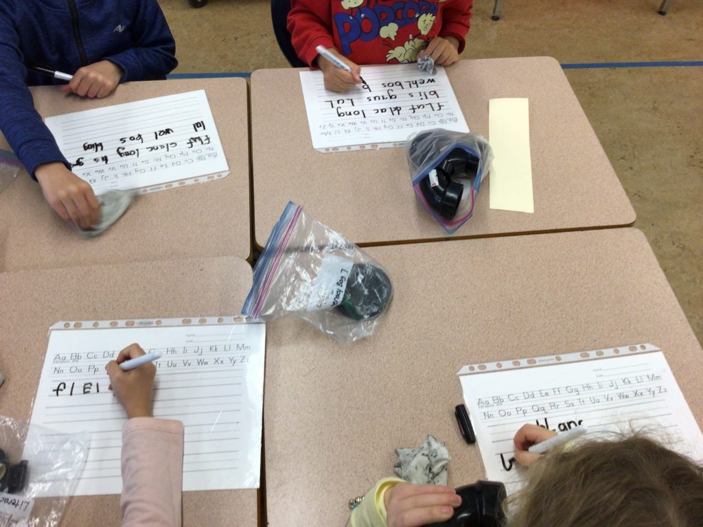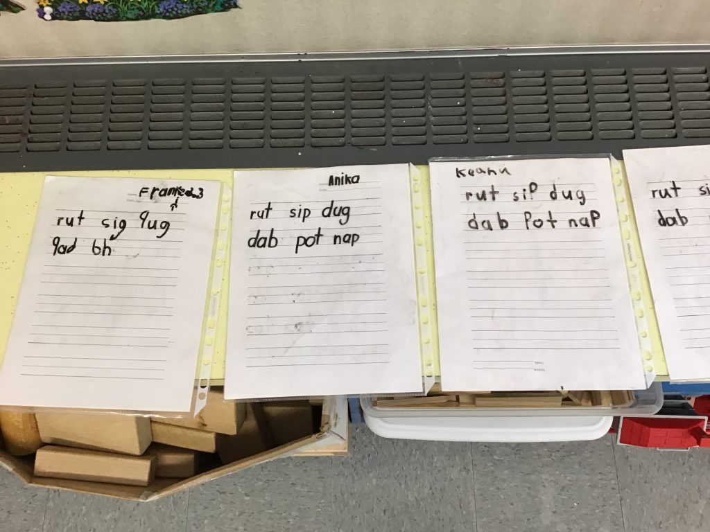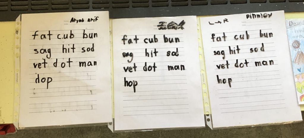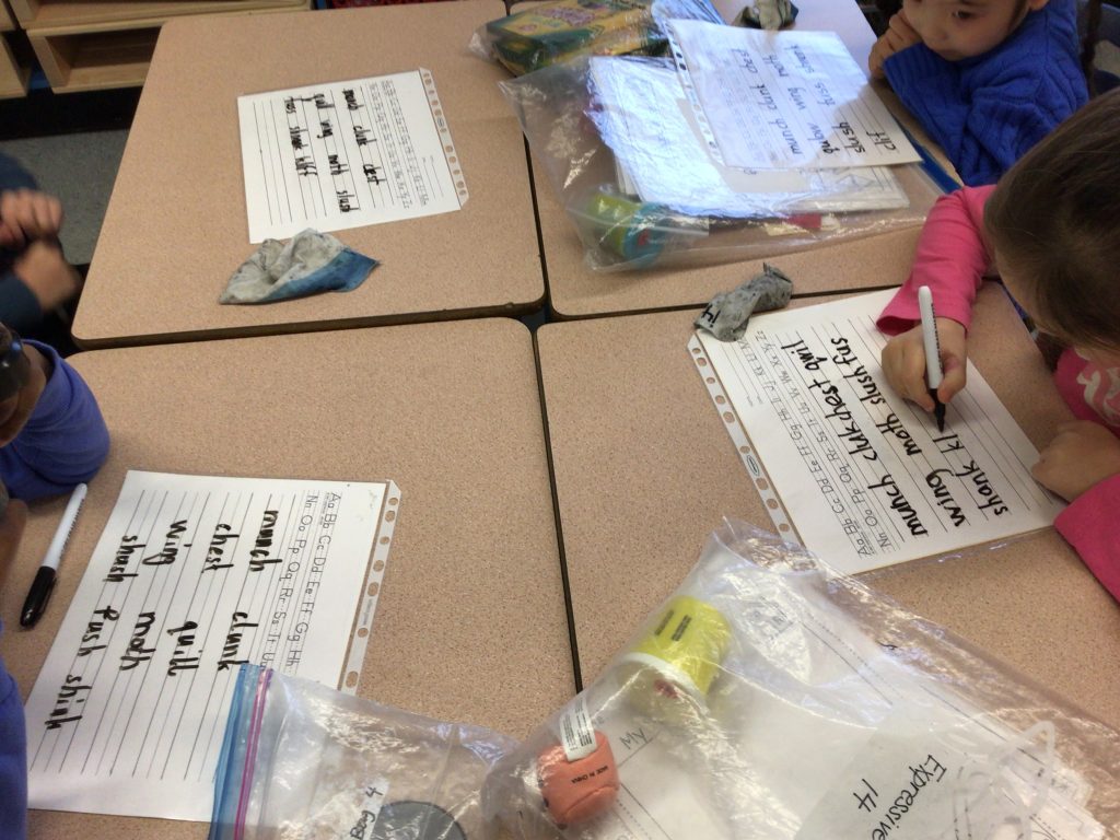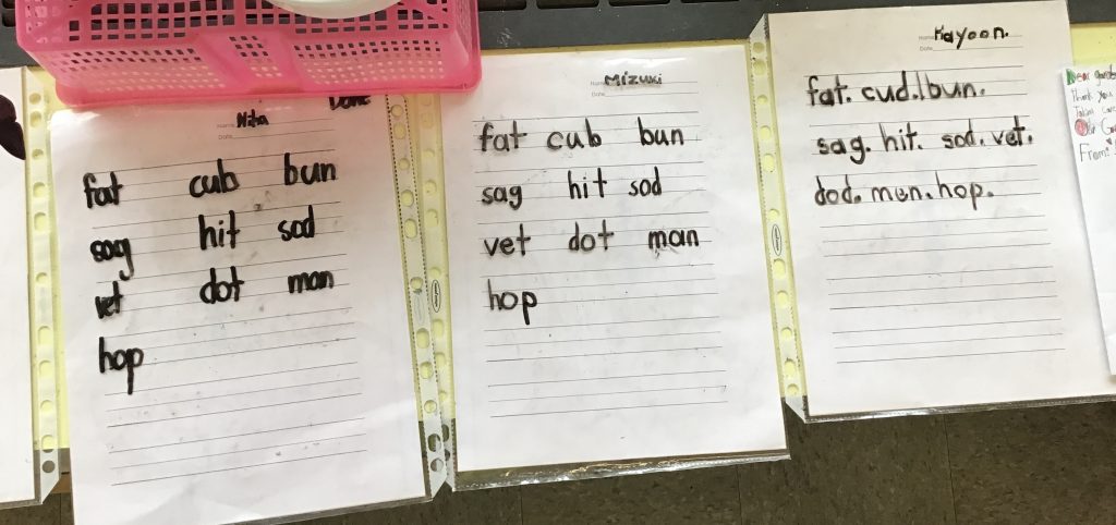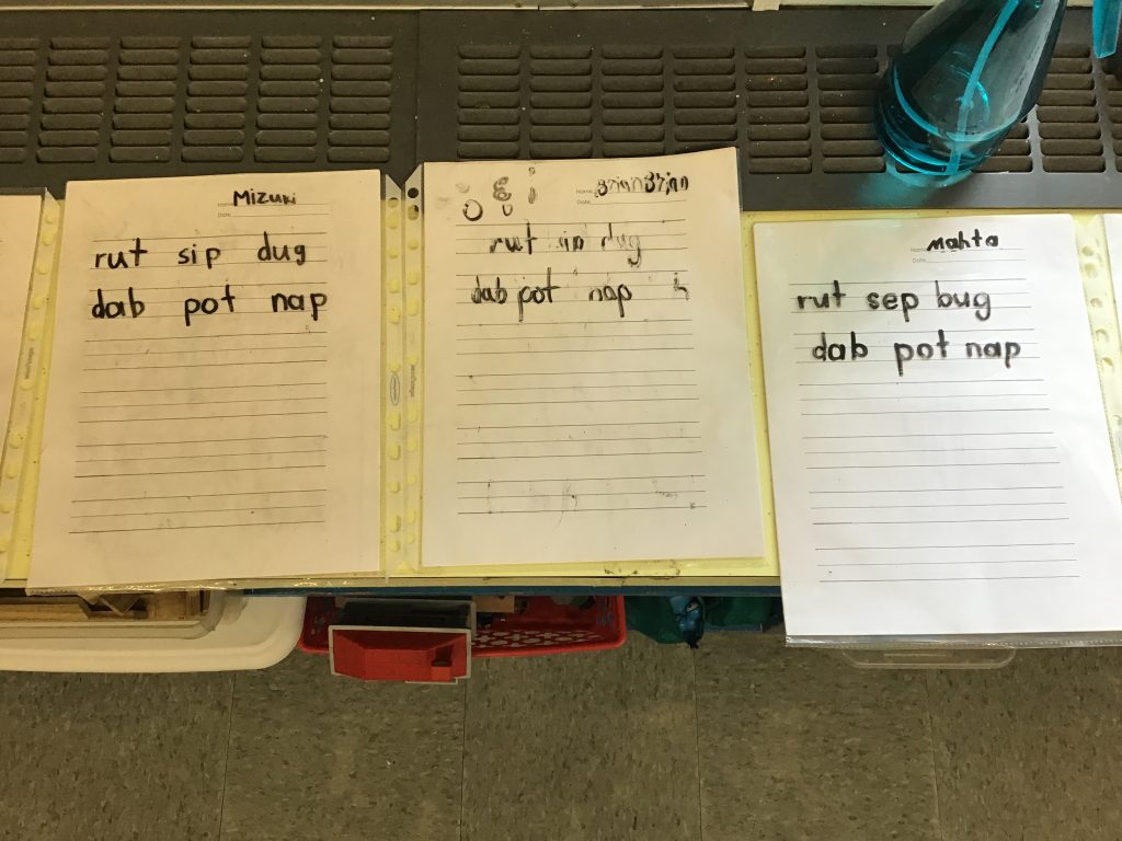 Starting the week of Oct. 20, we began to incorporate all the things we have learned so far (phonemic awareness, letter formation). We began spelling words that are dictated and used in a sentence by sounding out the phonemes and printing the letters using proper formation.