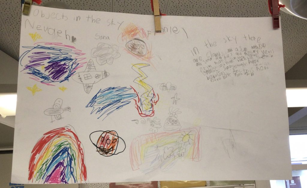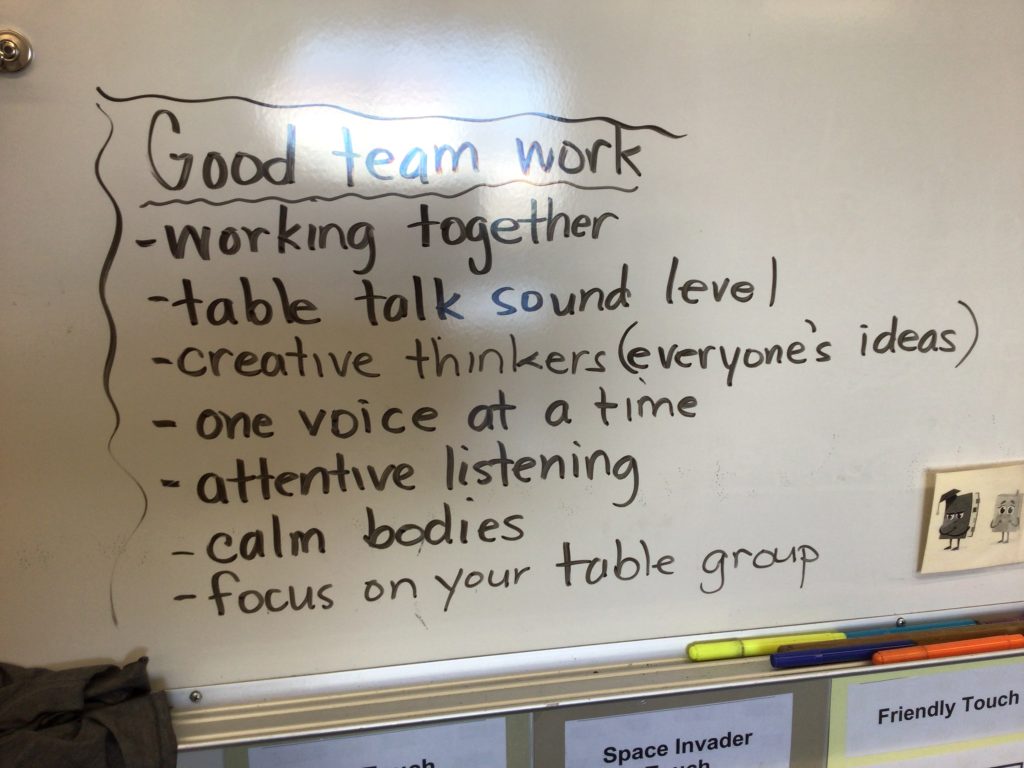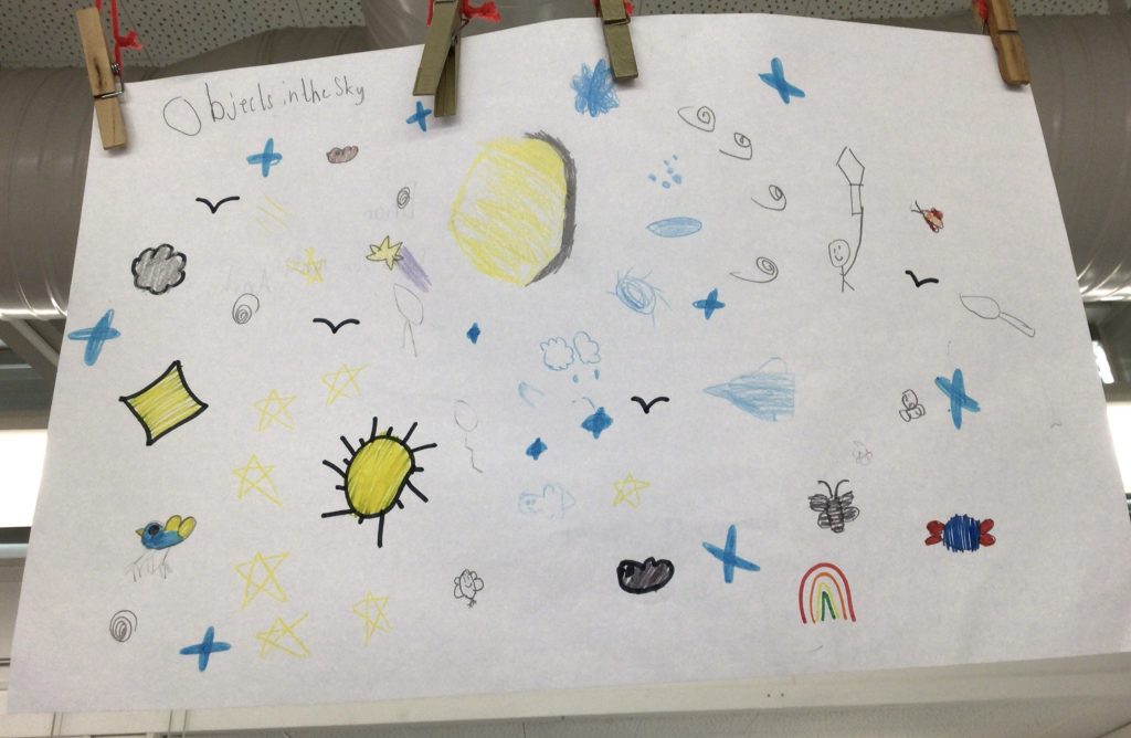 During the week of Jan 19, we began our new unit on objects in the sky. We worked with our table groups and brainstormed what we think we know about the objects in the sky. Before we began, we brainstormed what it would look and sound like for good team work to happen.