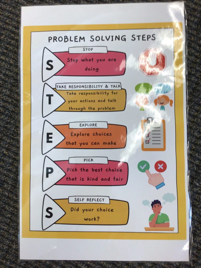 We have continued to reiterate the importance of making good choices by stopping, taking deep breaths, and thinking before we say or do anything. However, if miss the stopping, taking deep breaths, and thinking, it often leads to problems. Therefore, we will need to use STEPS to solve our problems.