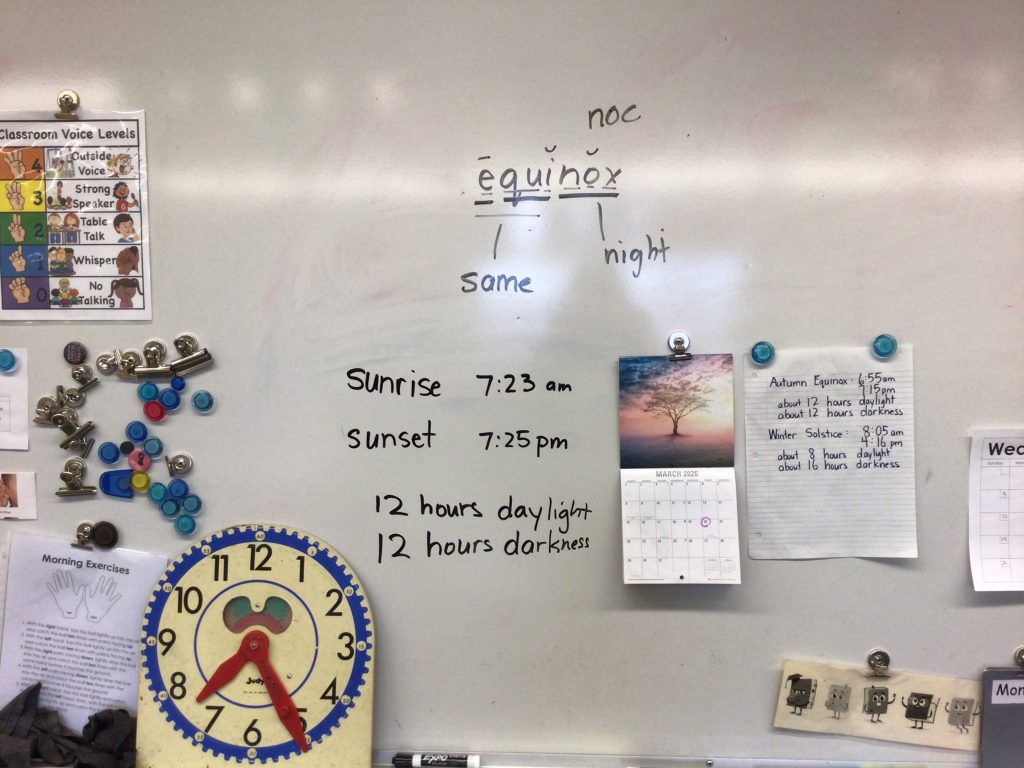 The spring equinox, or the first day of spring occurred on Mar. 20 at 7:46 am, while we were on spring break. We looked closely at the word equinox and tried to figure what parts of the word we could recognize. We noticed that the word has a “equ” which we have heard in the word “equal”. Then we looked at the “nox” or “noc” and remembered “nocturnal animals” were animals that were awake at night. We learned that sunrise on Mar. 20 was at 7:23 am and the sunset was 7:25 pm that same day. Therefore, the number of daylight hours is about the same number of hours of darkness.