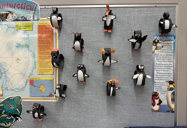 The penguin’s name is Pringle. She arrived with a journal and a copy of Mr. Popper’s Penguins, written by Florence Atwater.