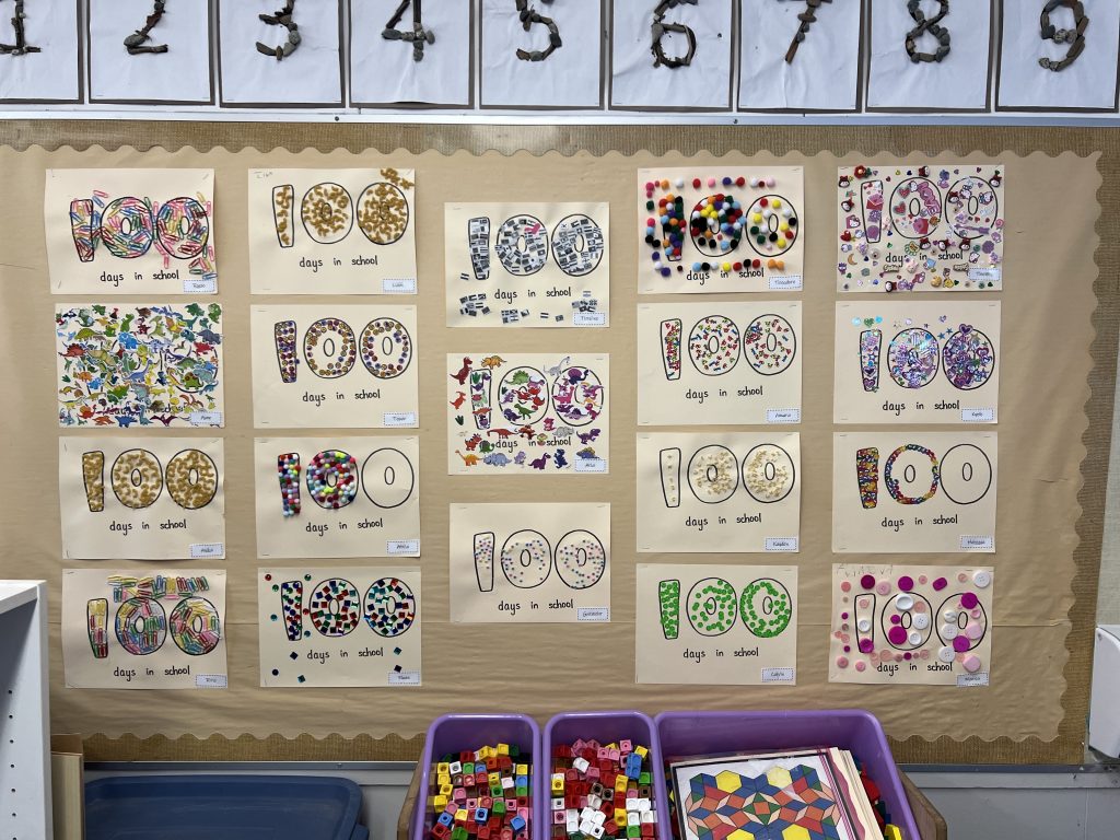 - Collect 100 small things of the same thing (i.e. paper clips, pom poms) and display it on a poster