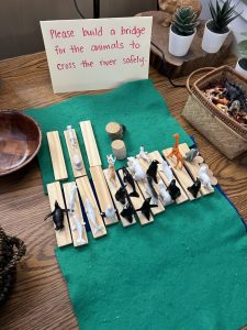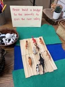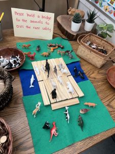 At our provocation table, our students are asked to build a bridge for the animals to cross the river safely. Students were creative in building a bridge for the animals.